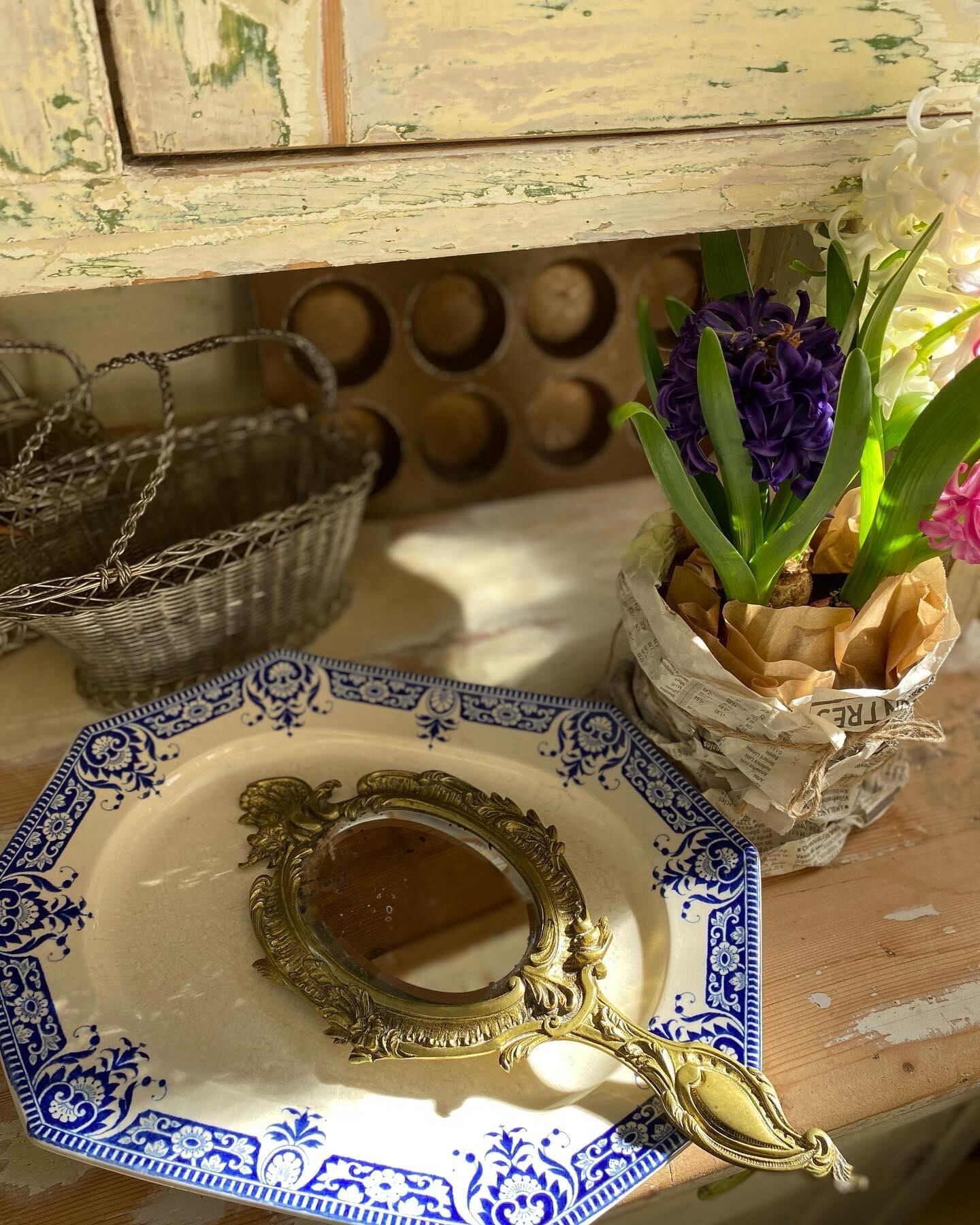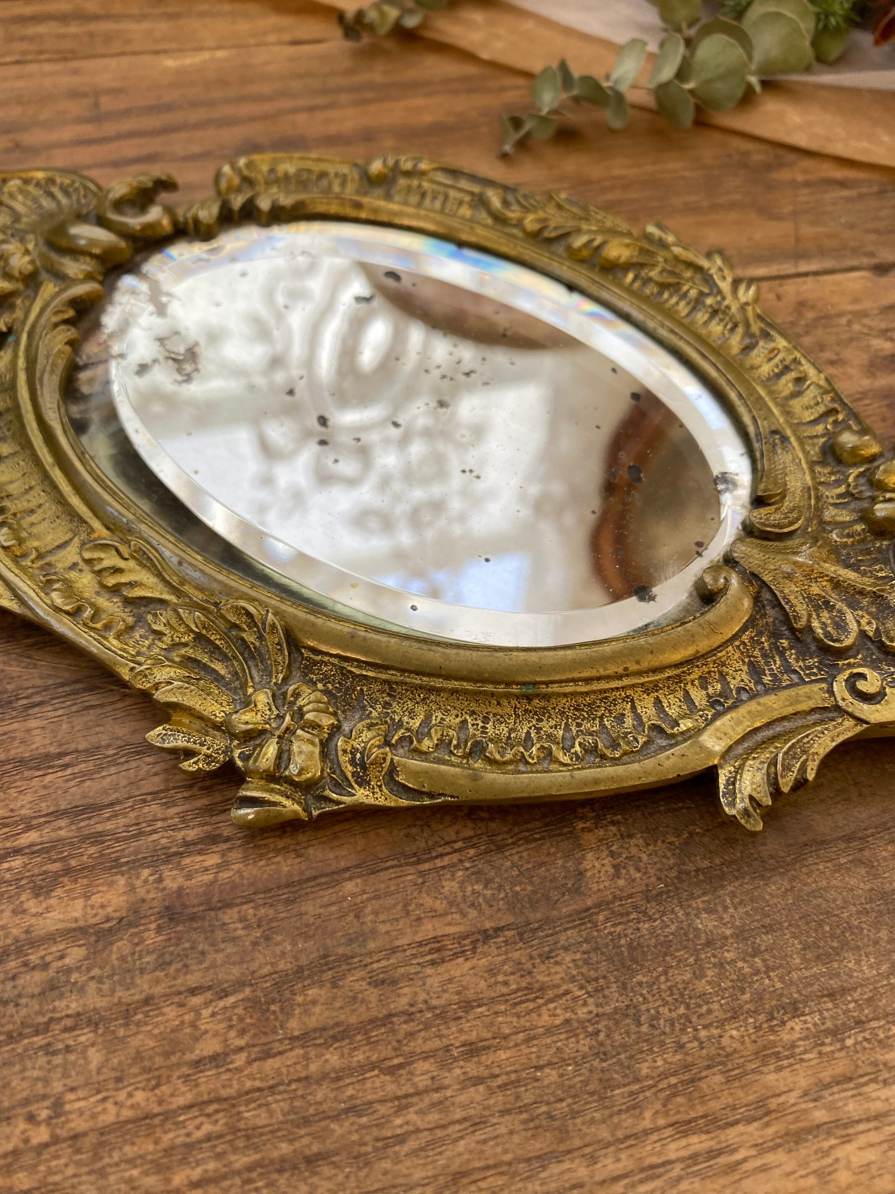 またオルモルの部分にも黒ずみや青く変色した箇所がございますがアンティークの味わいとして、とても素敵なハンドミラーとなっています。