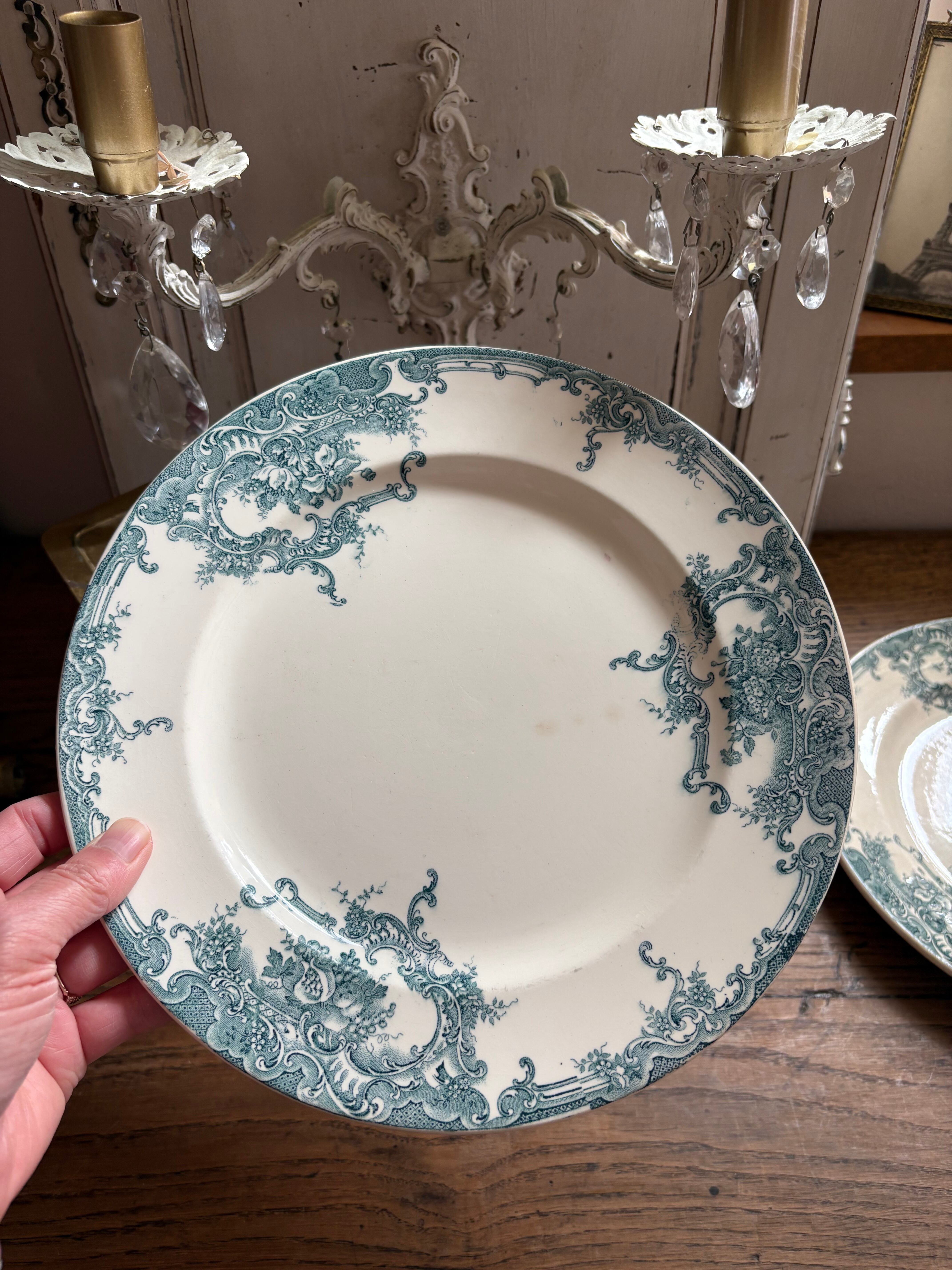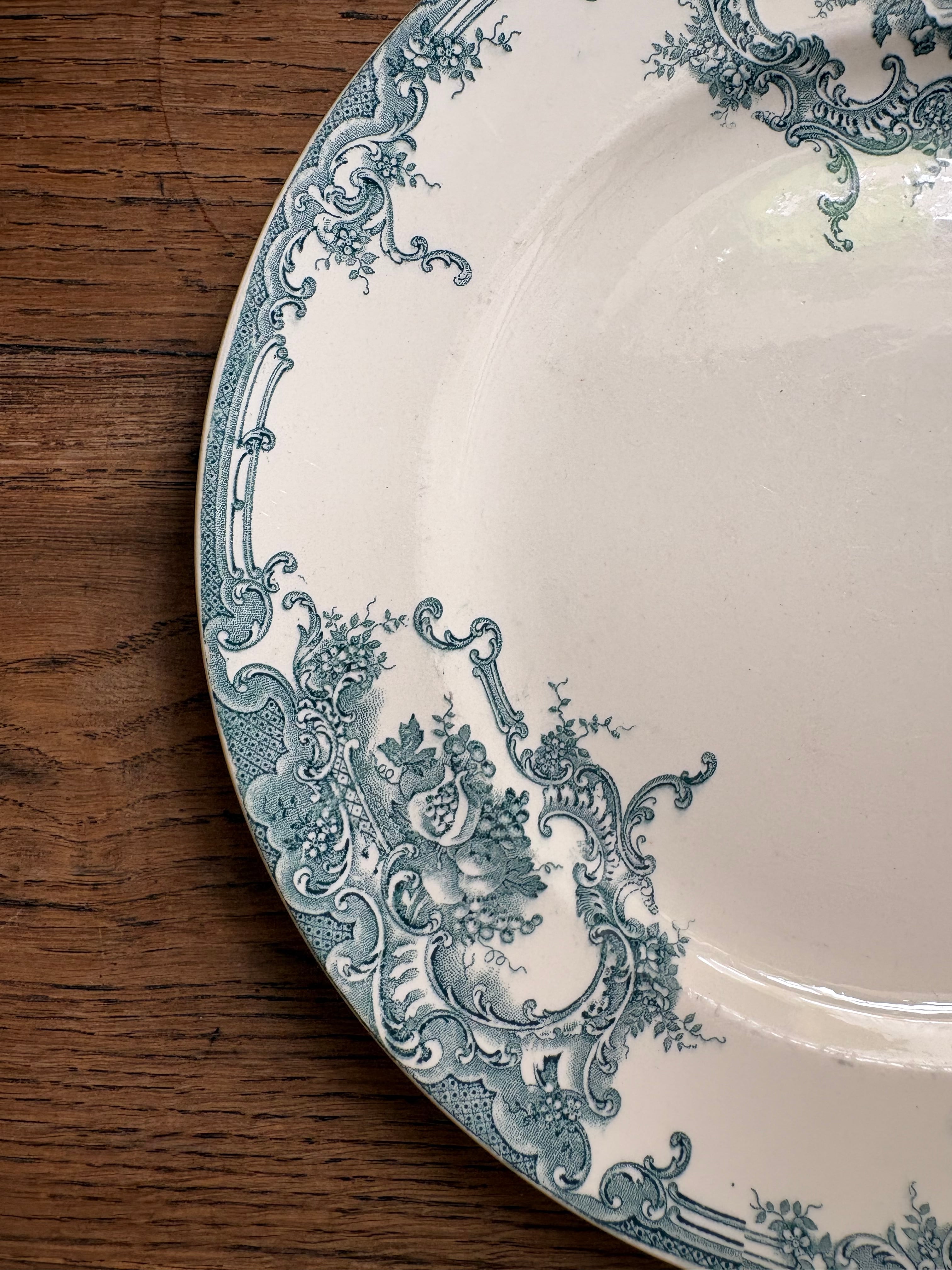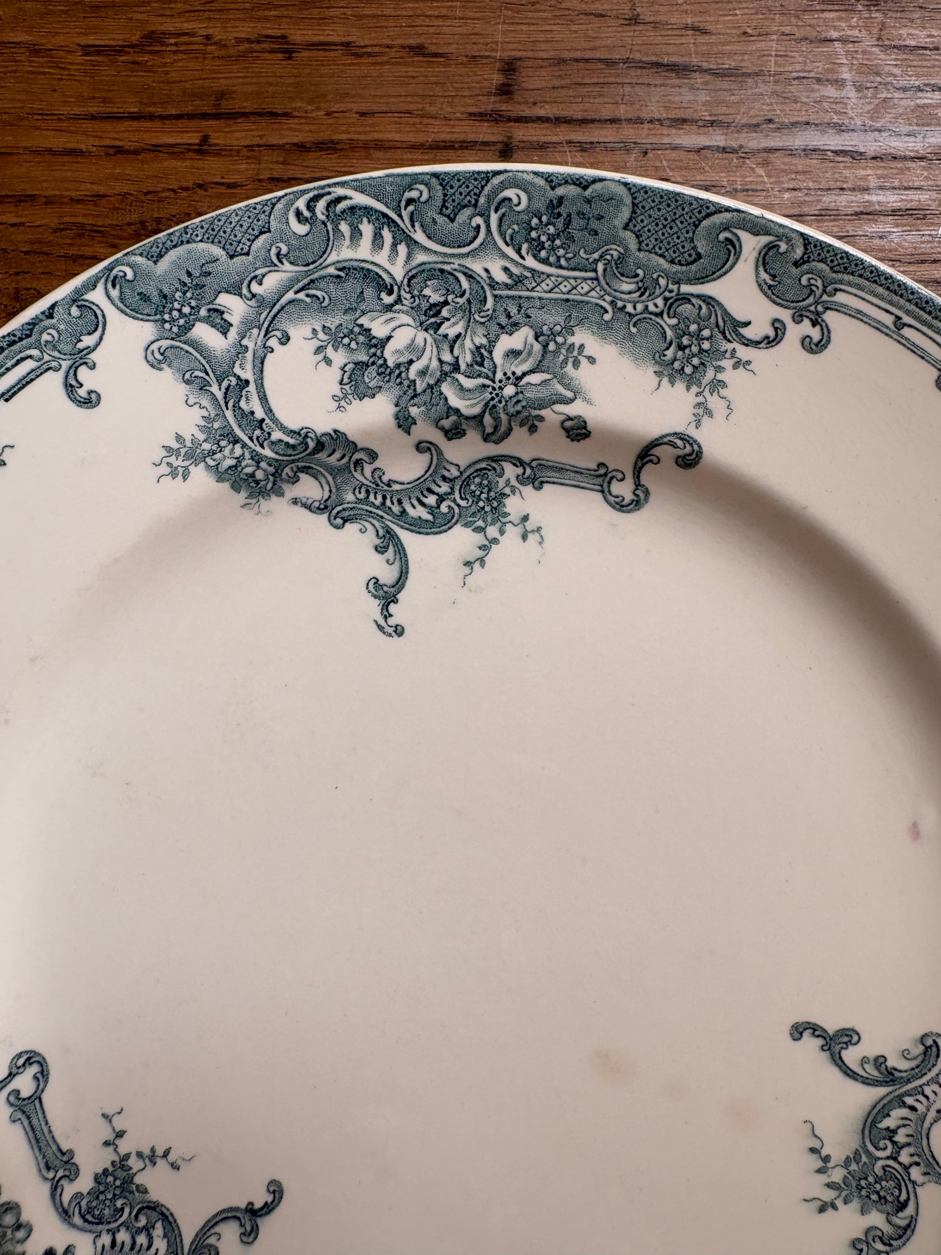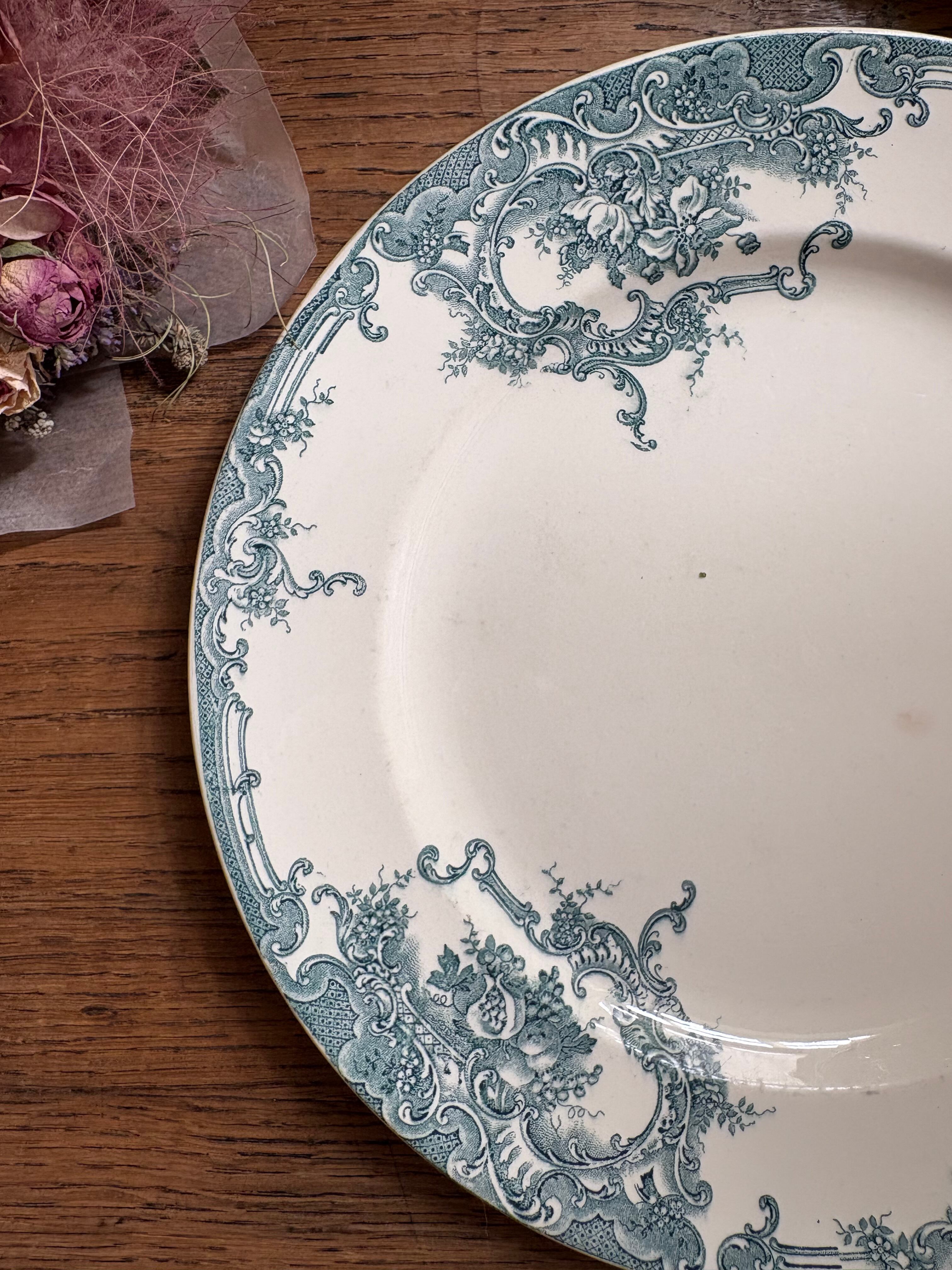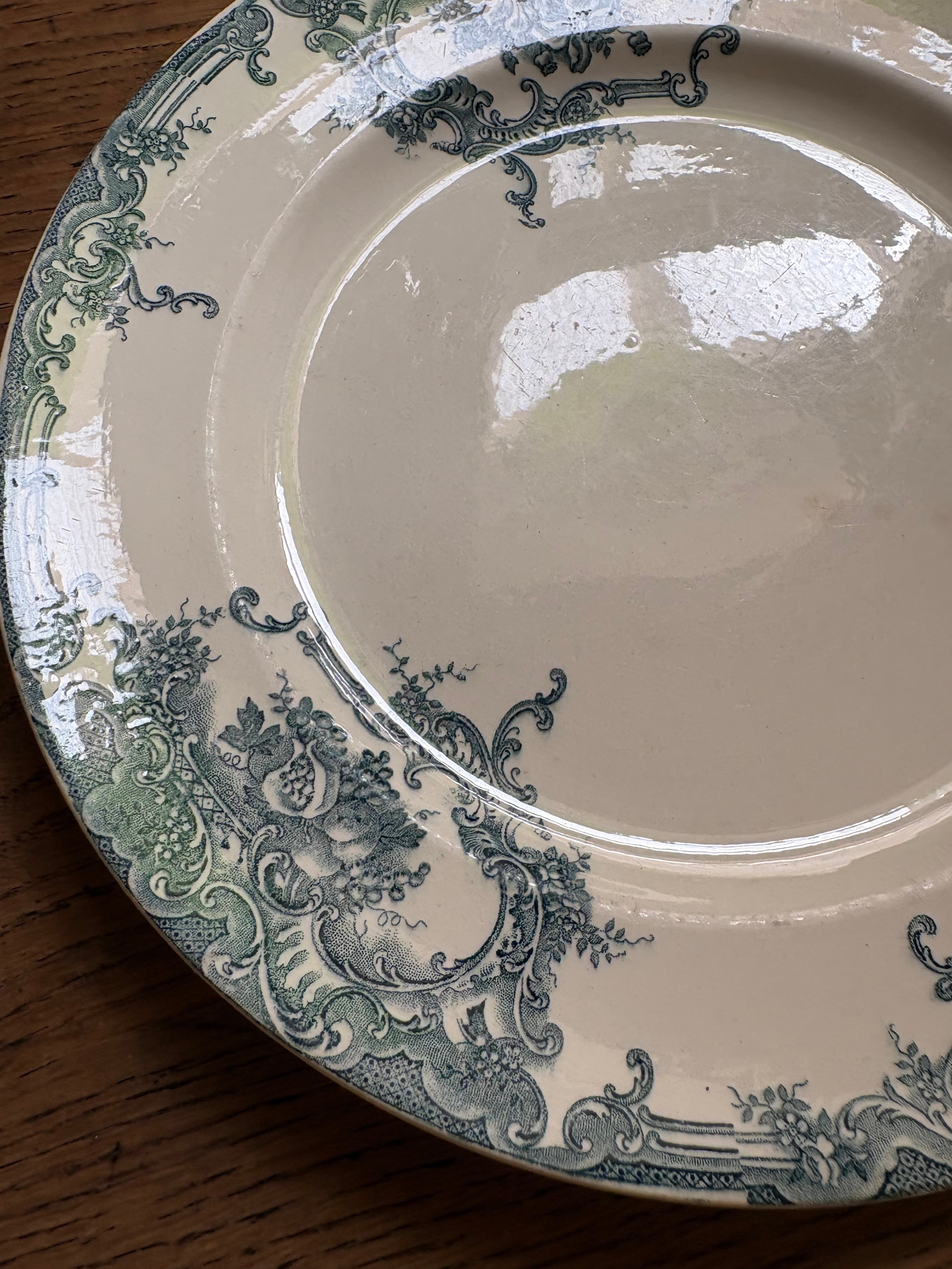 ロカイユ模様と花模様がエレガントなプレート、25cmとやや大ぶりなディナープレートになります。深みのあるグリーンが大人っぽさを感じます。