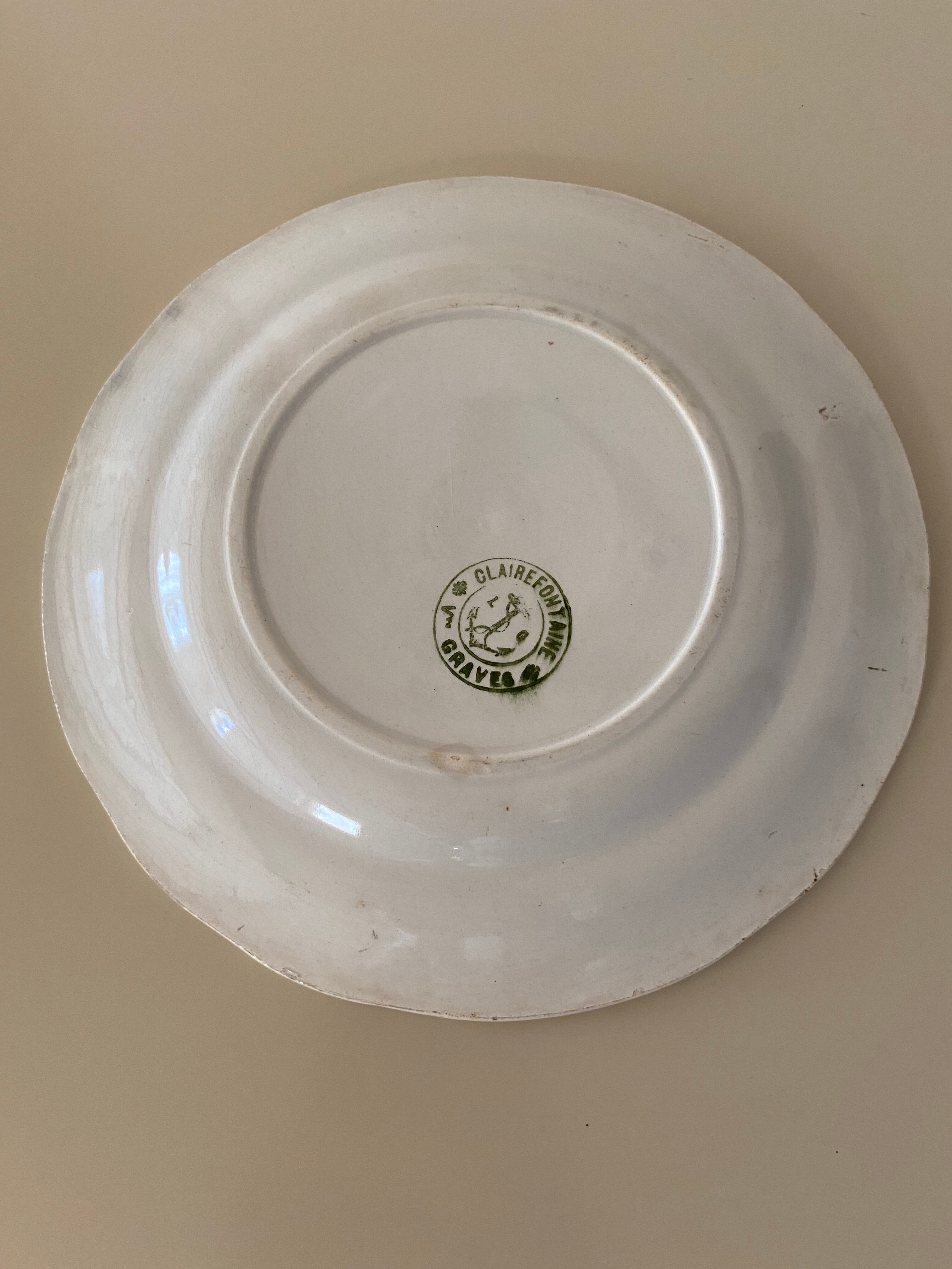 Clairefontaineは1802年にクレールフォンテーヌ修道院の跡地に開窯して1932年まであった比較的小規模ながら良質な食器を作っていた窯元で、バックスタンプの「LG」は1894〜1913年のレオン・グラーヴ時代のものです。