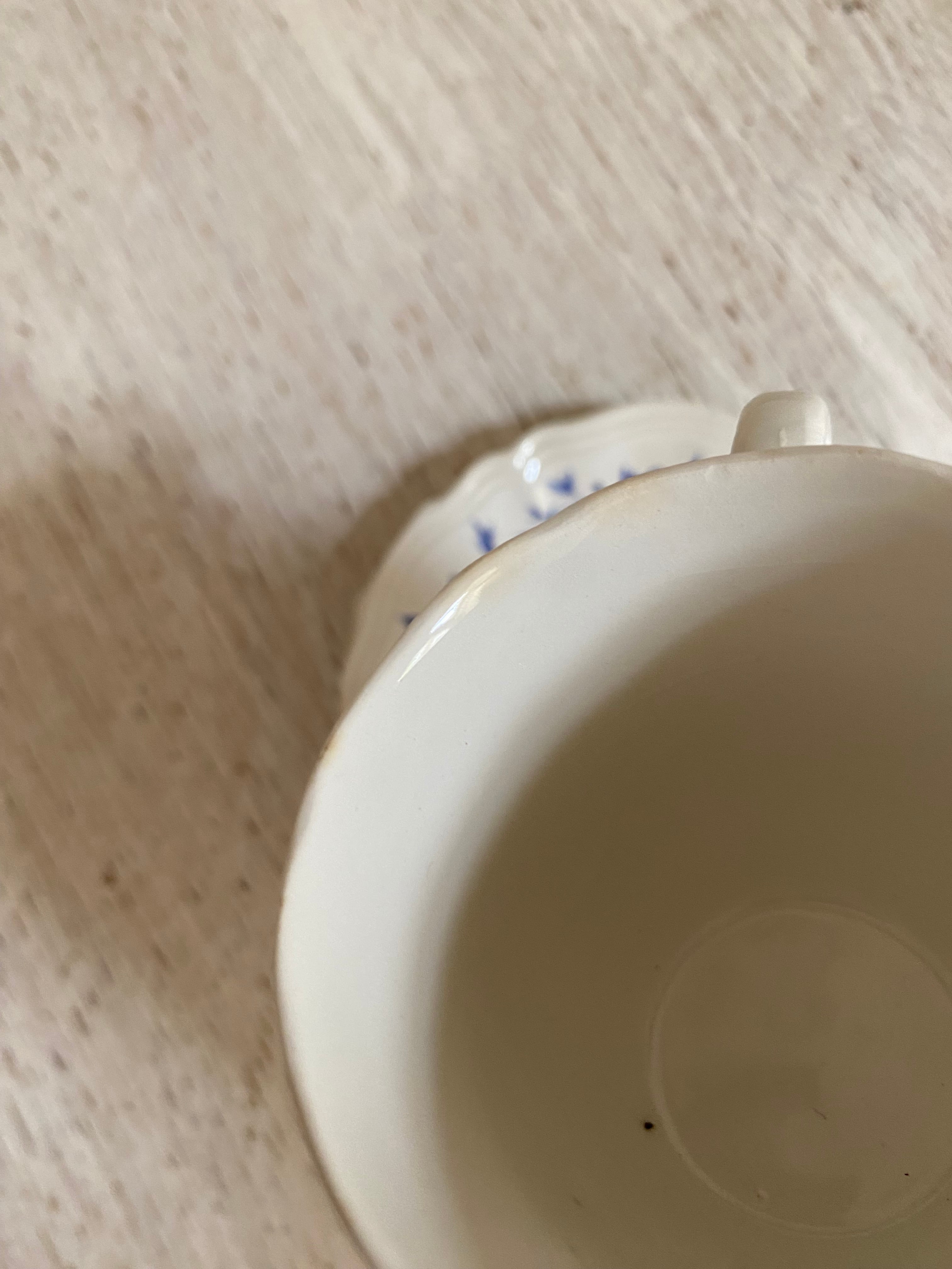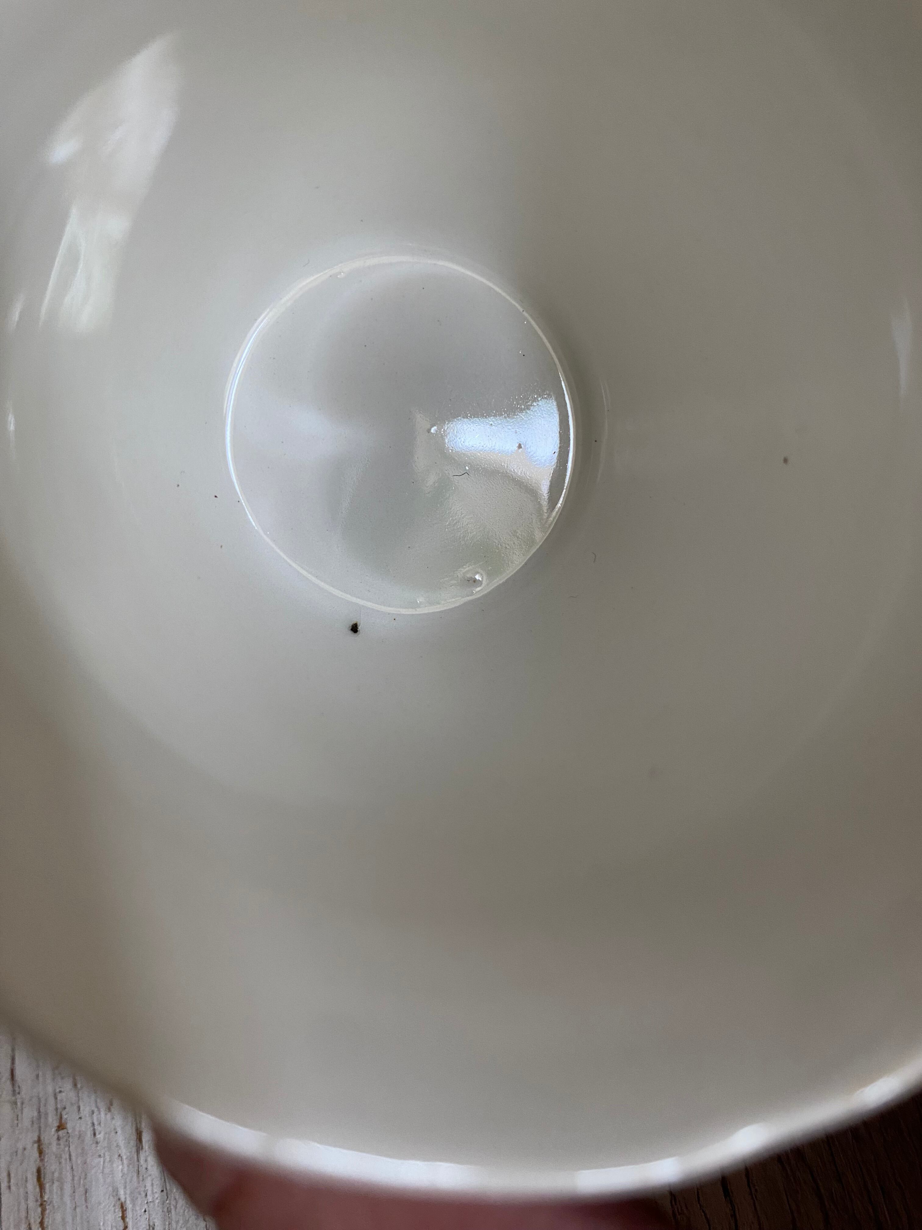 ほとんど使用感を感じさせないものですがカップの縁に茶色く変色した箇所がございます。カップ内側には黒く付着したものがあります。貫入も見られます。