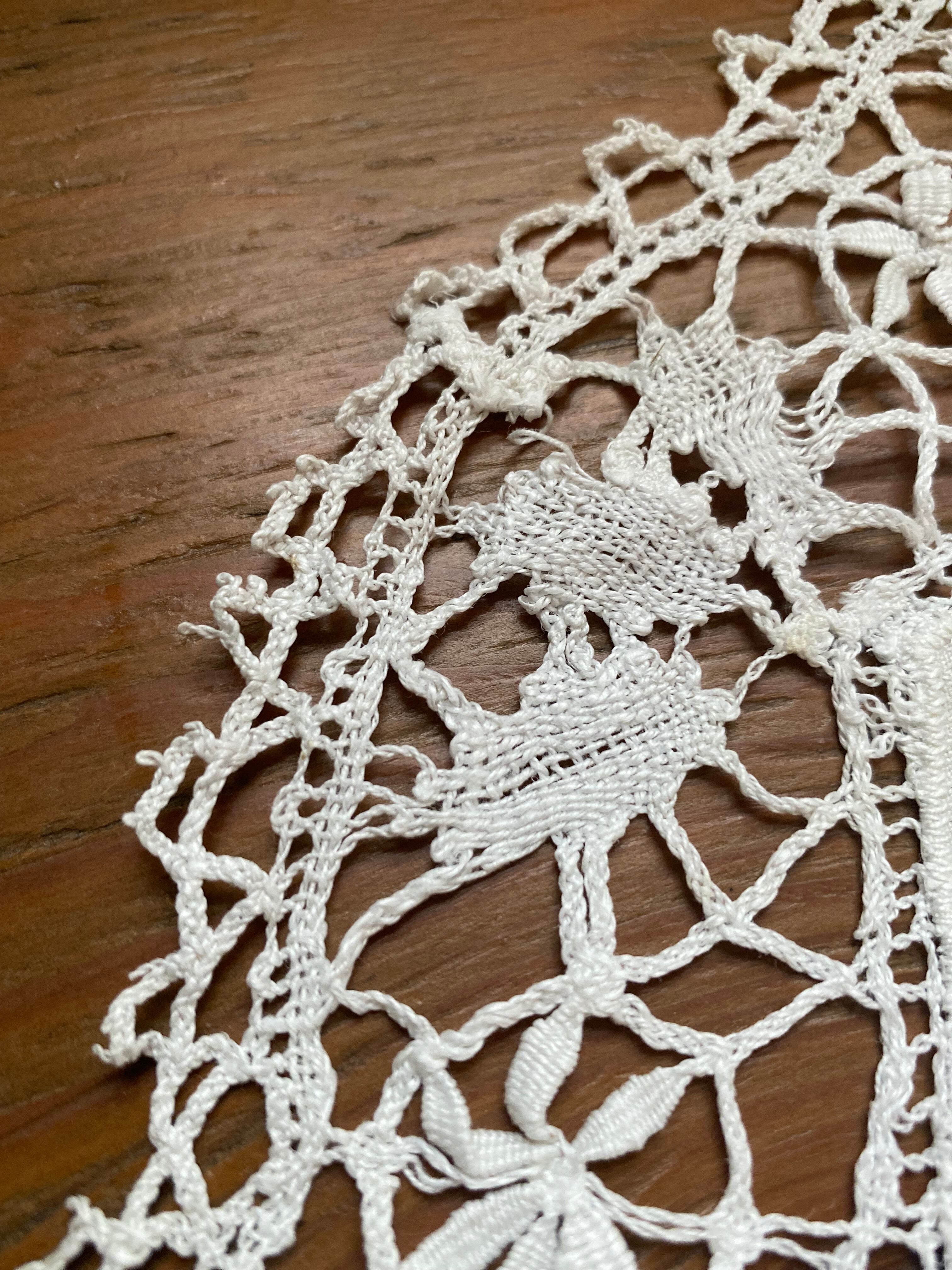 周りに編み込まれたレースも、リネン糸でしっかりとした状態です。