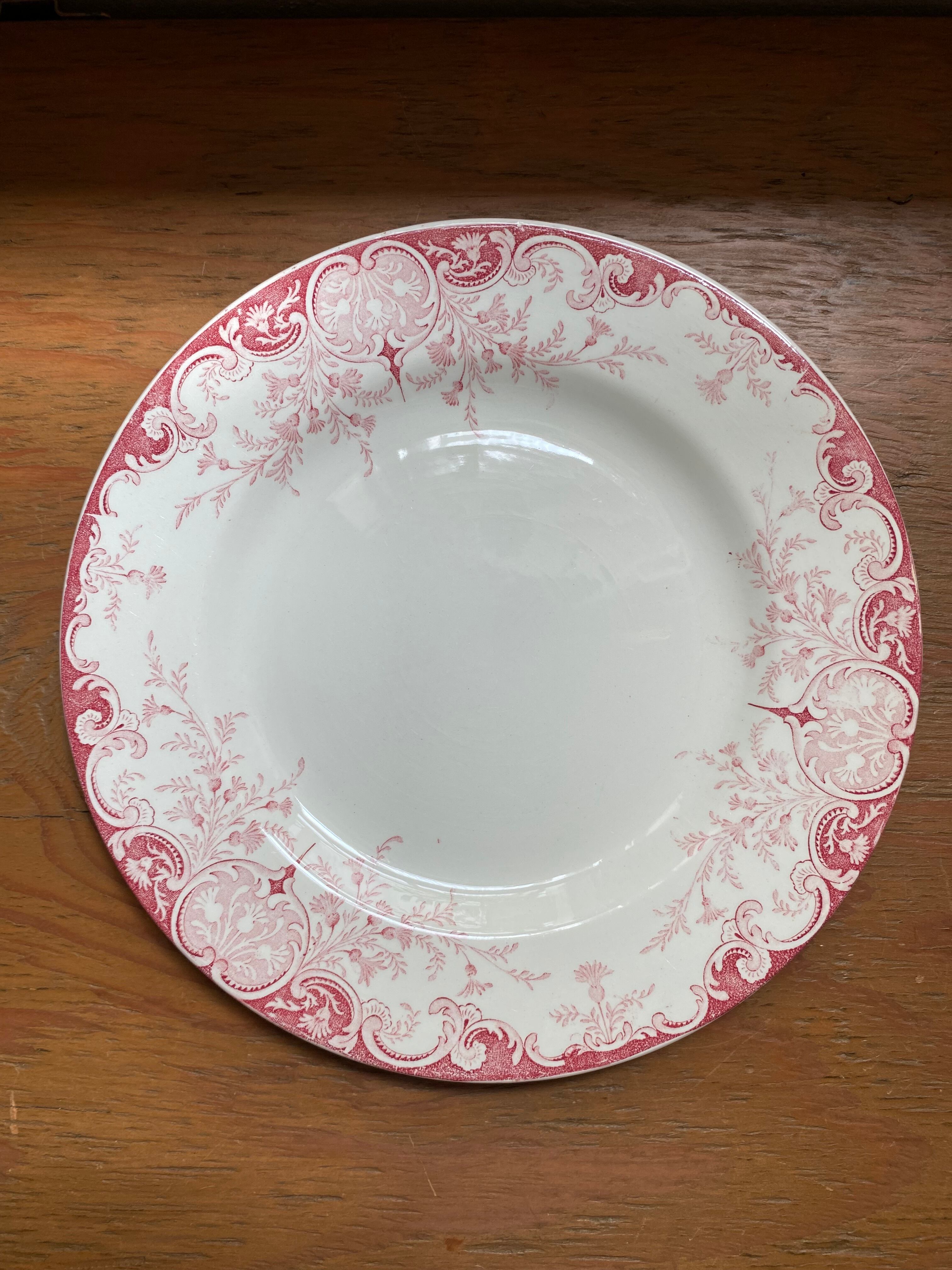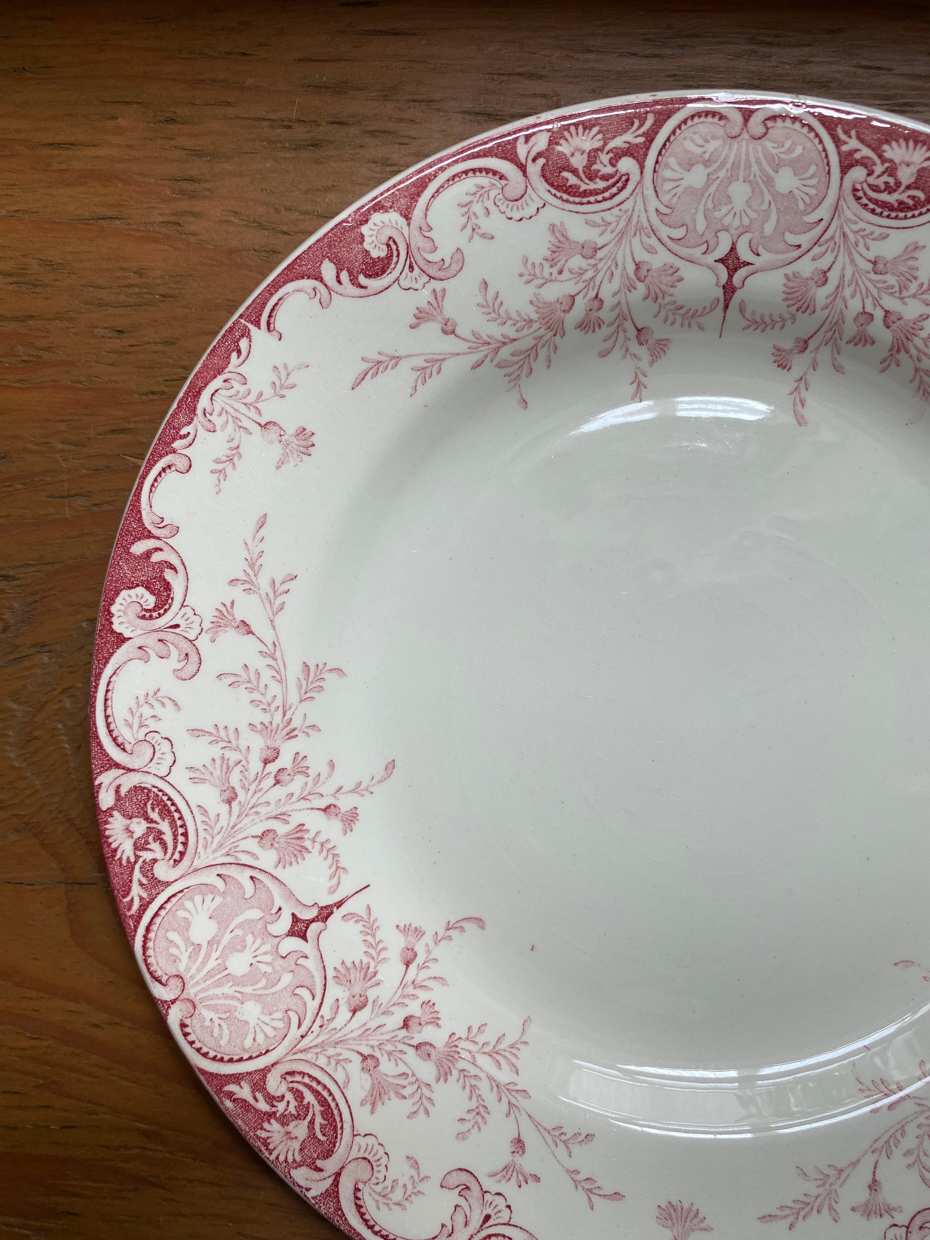 クリームカラーをベースに紫がかったピンクのロカイユなデザインと植物が転写されたプレートになります。