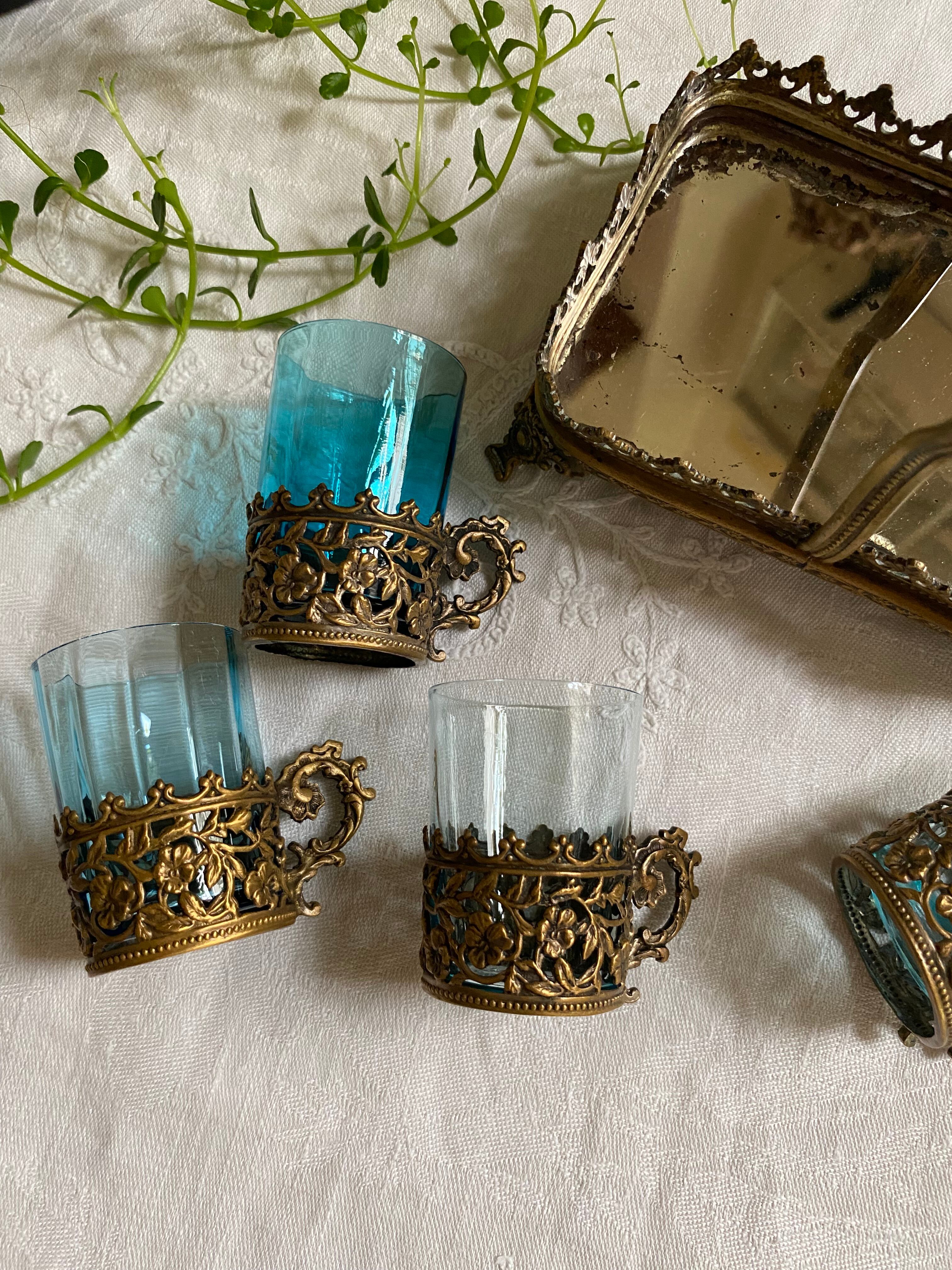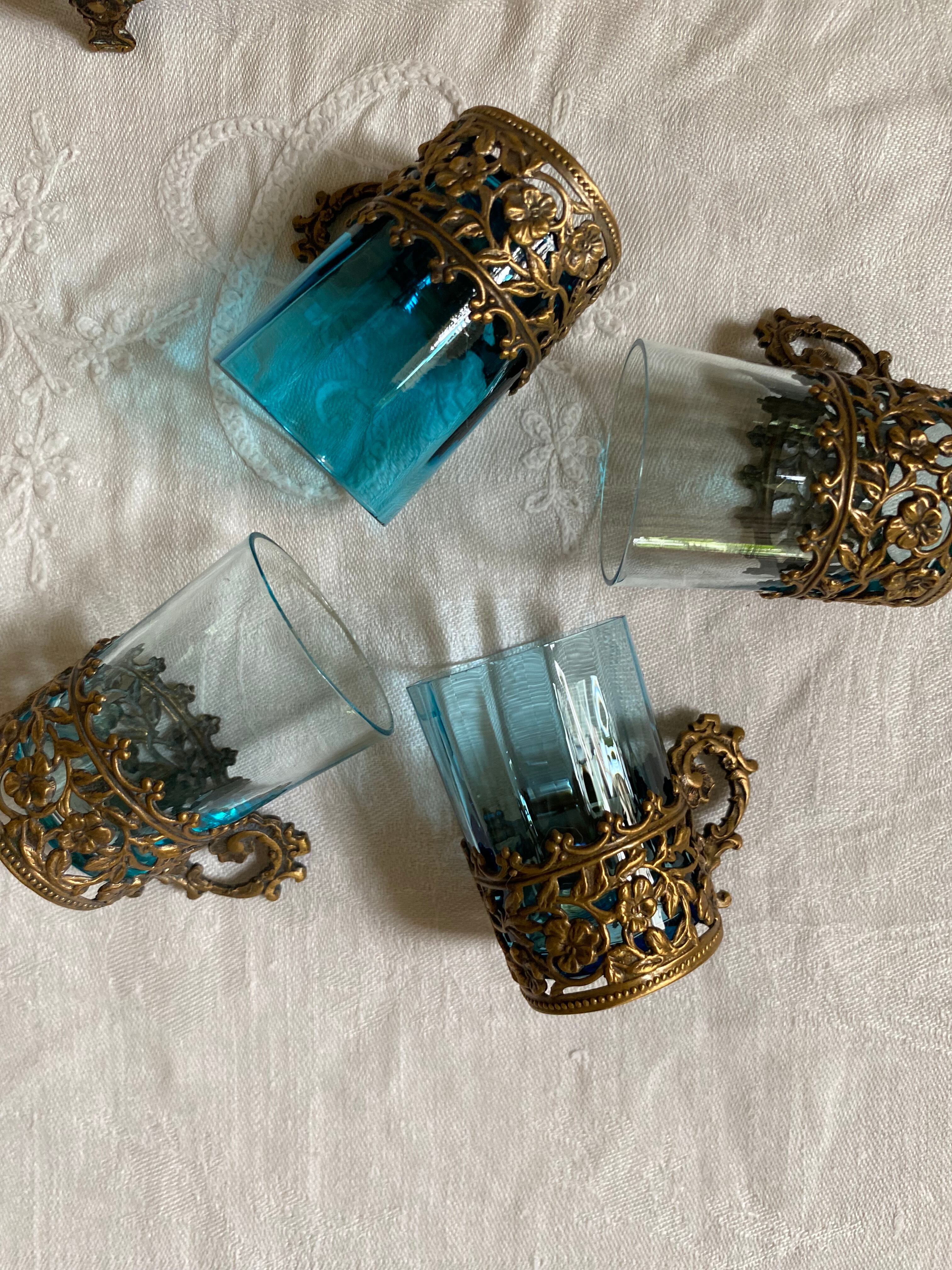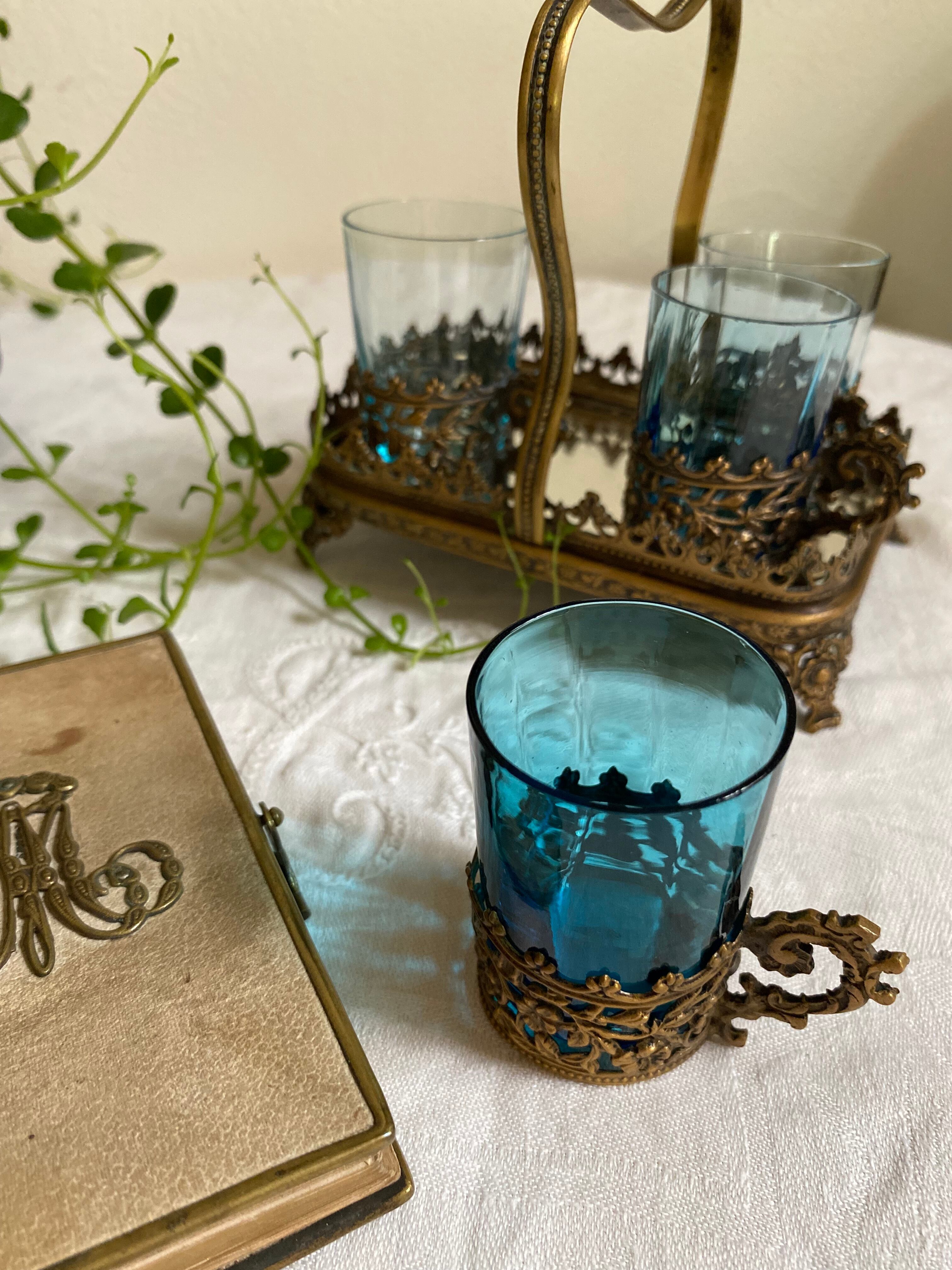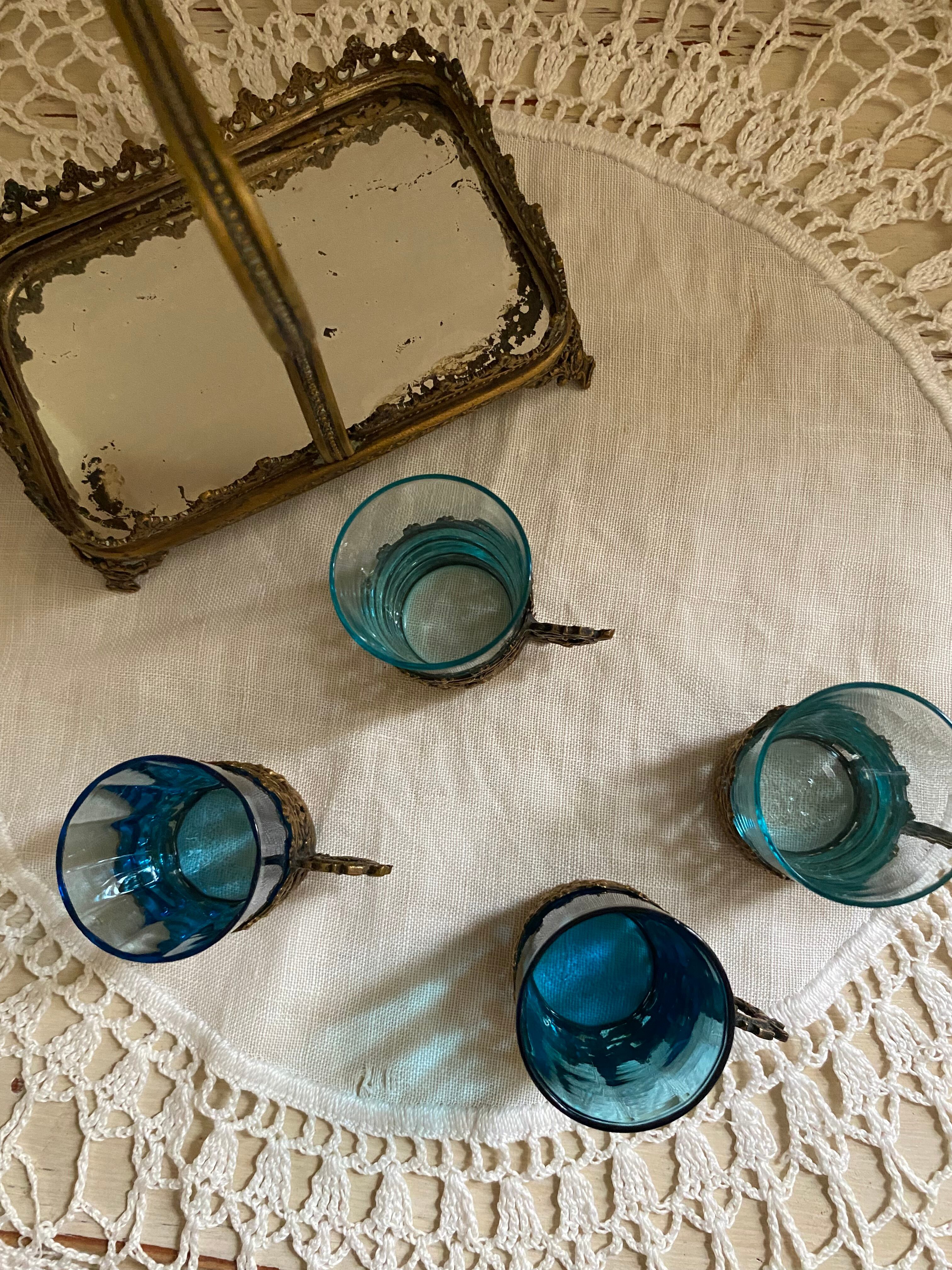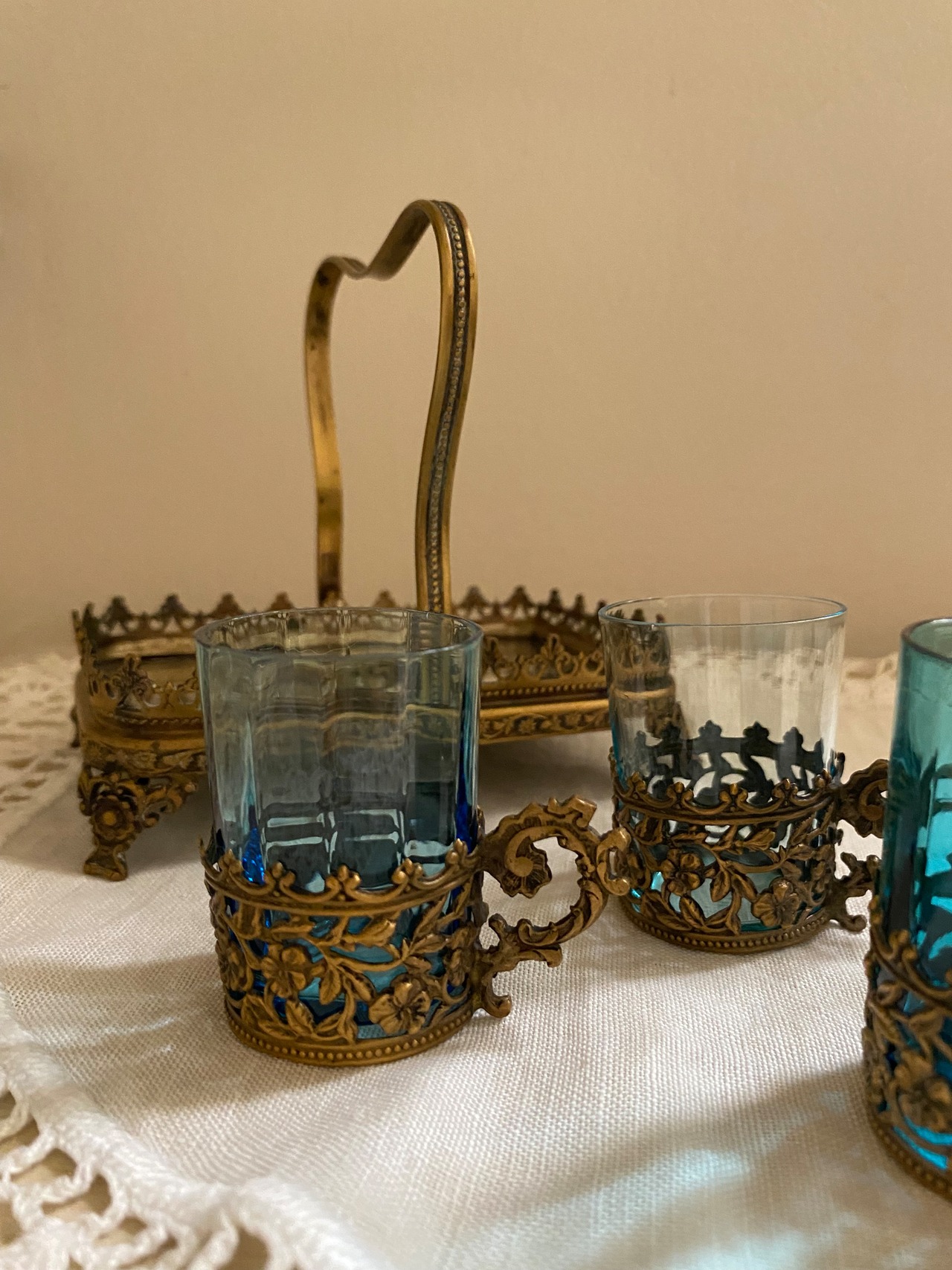 真鍮のバスケットに蒼いアペリティフ(食前酒)のカップがお行儀良く並んだ素敵なデザインになっております。