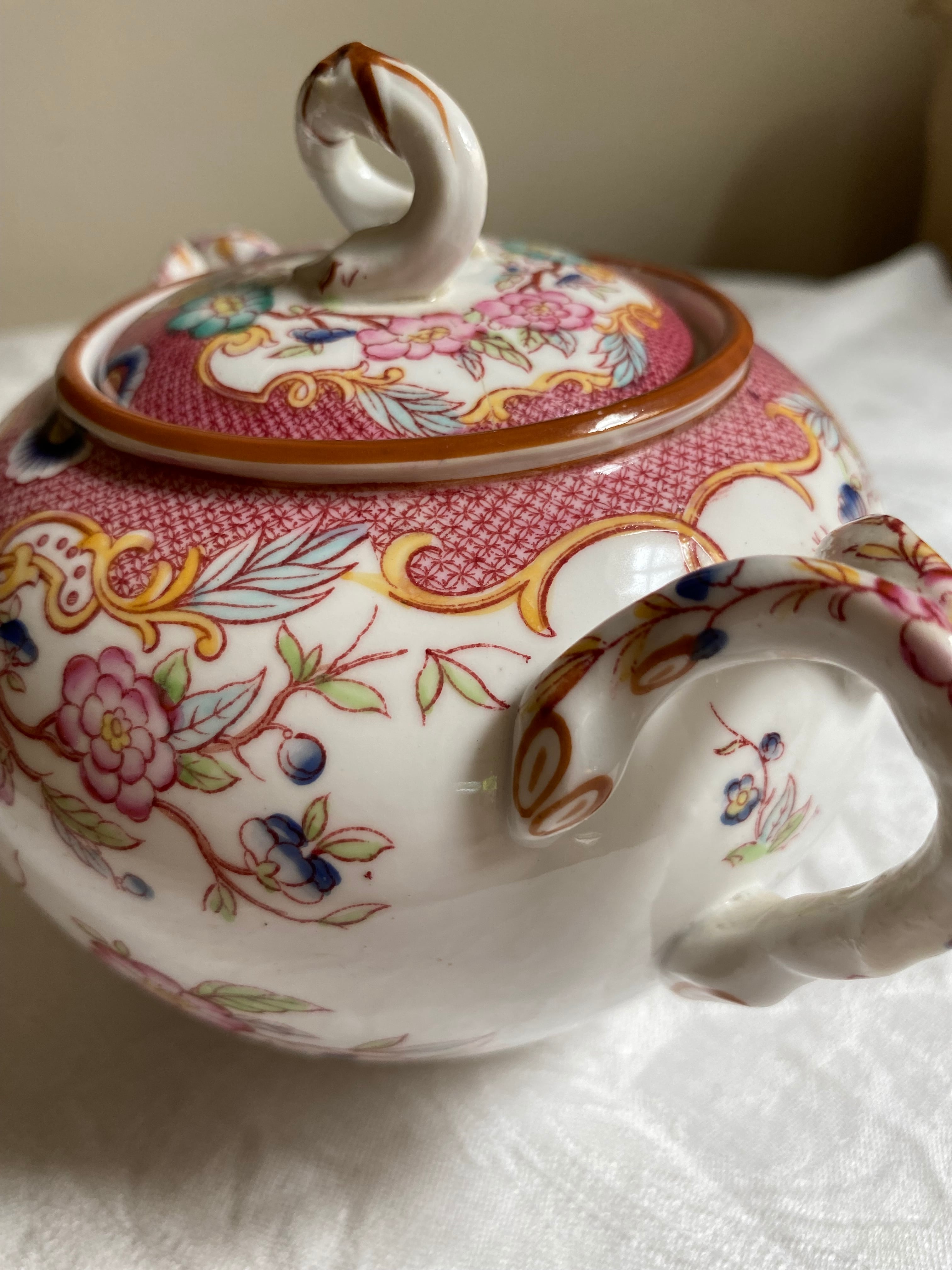 シノワズリで美しいデザインは転写と一部手描きによるもの、また、磁気の透き通る白さは光りをあてるととても綺麗です。