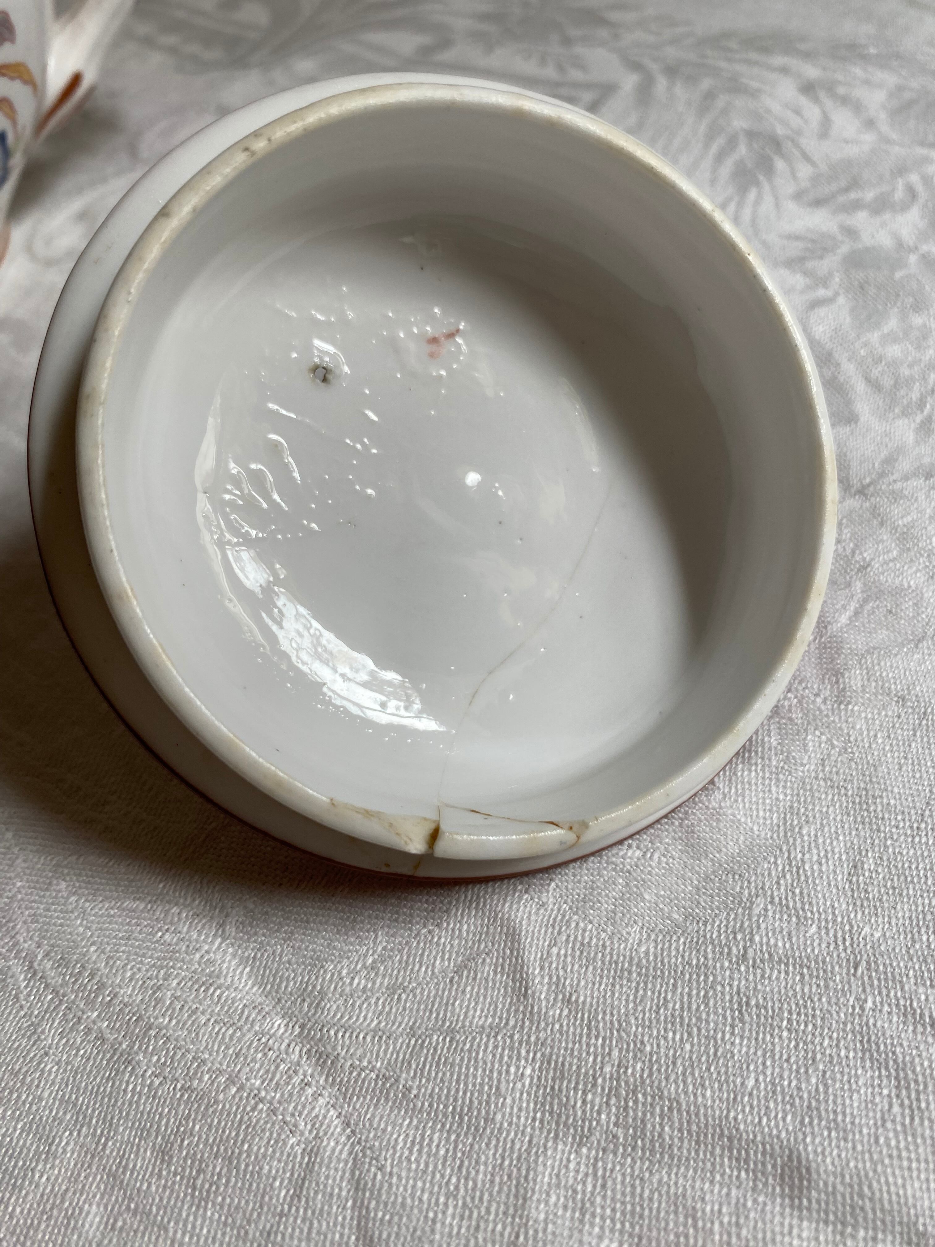 蓋の裏側に欠けて修復跡が見られます。注ぎ口奥の箇所に汚れの付着、、洗浄済ですが少しとれにくい箇所に残ってます。