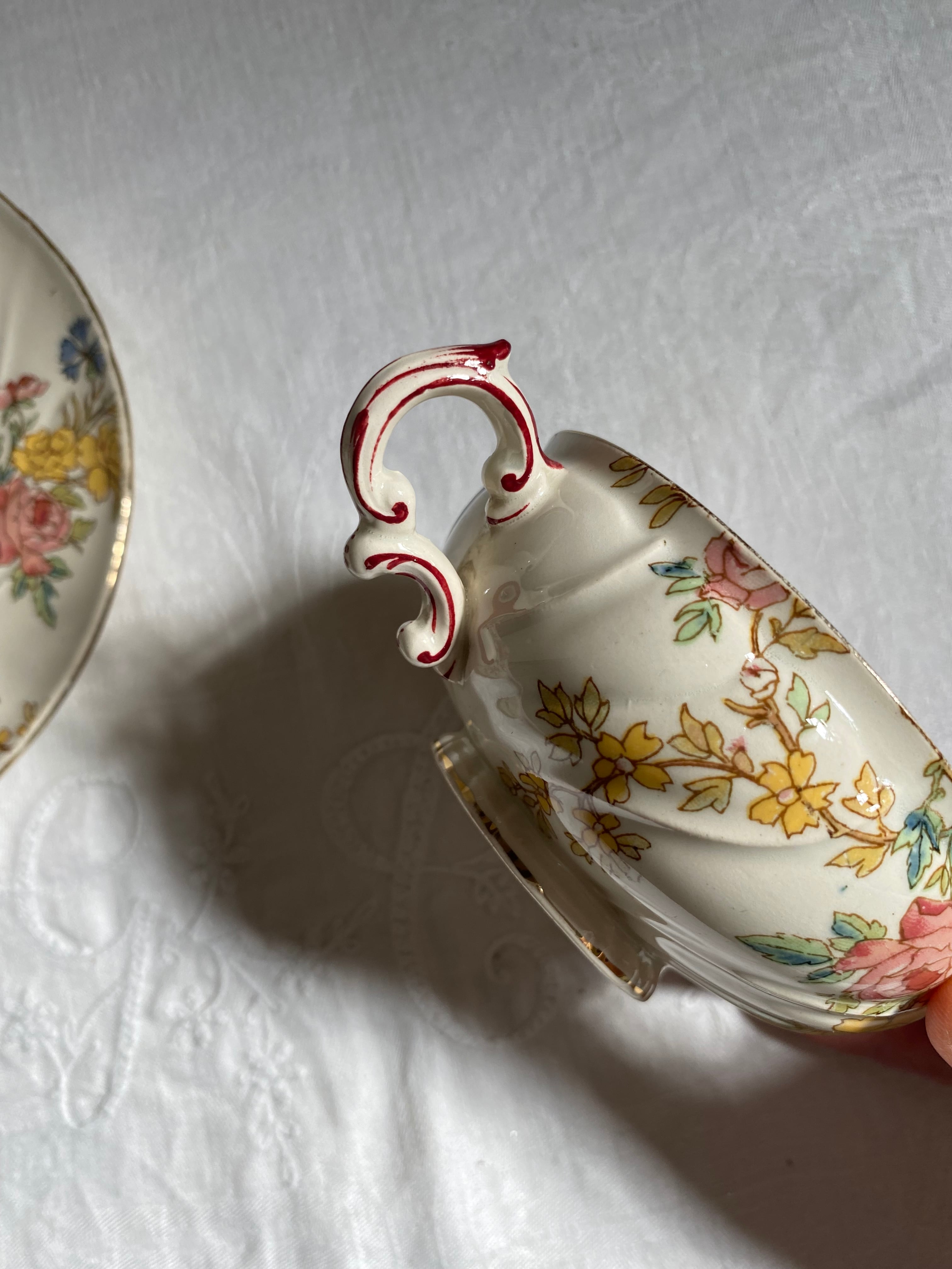 クラシカルな花模様には薔薇や撫子などとピンクや黄色、水色と可愛いらしい印象、フランスの良き時代のお城の中へと迷い込んでしまったような、美しすぎるカップとなっております。