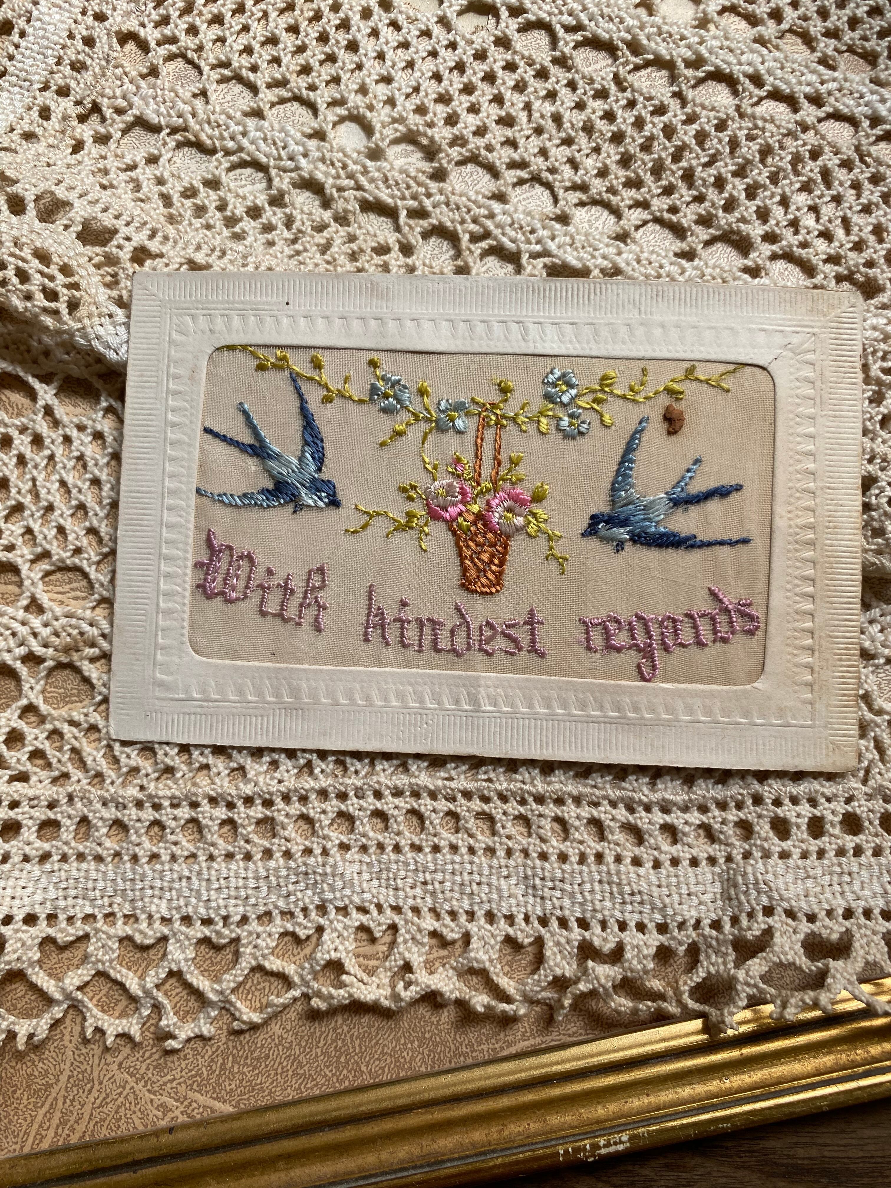青い鳥とパニエ 手刺繍カード フランスアンティーク アンティーク雑貨
