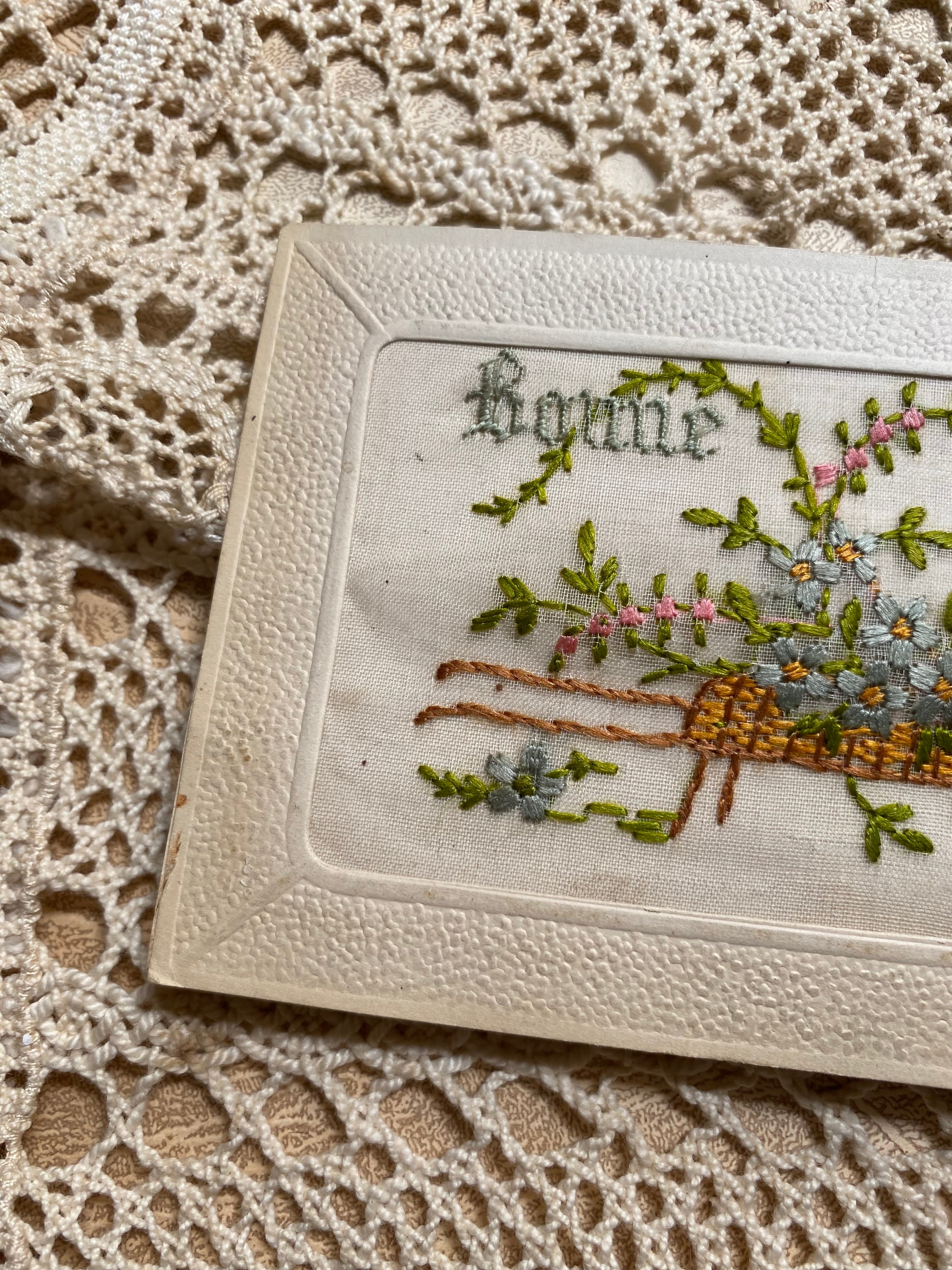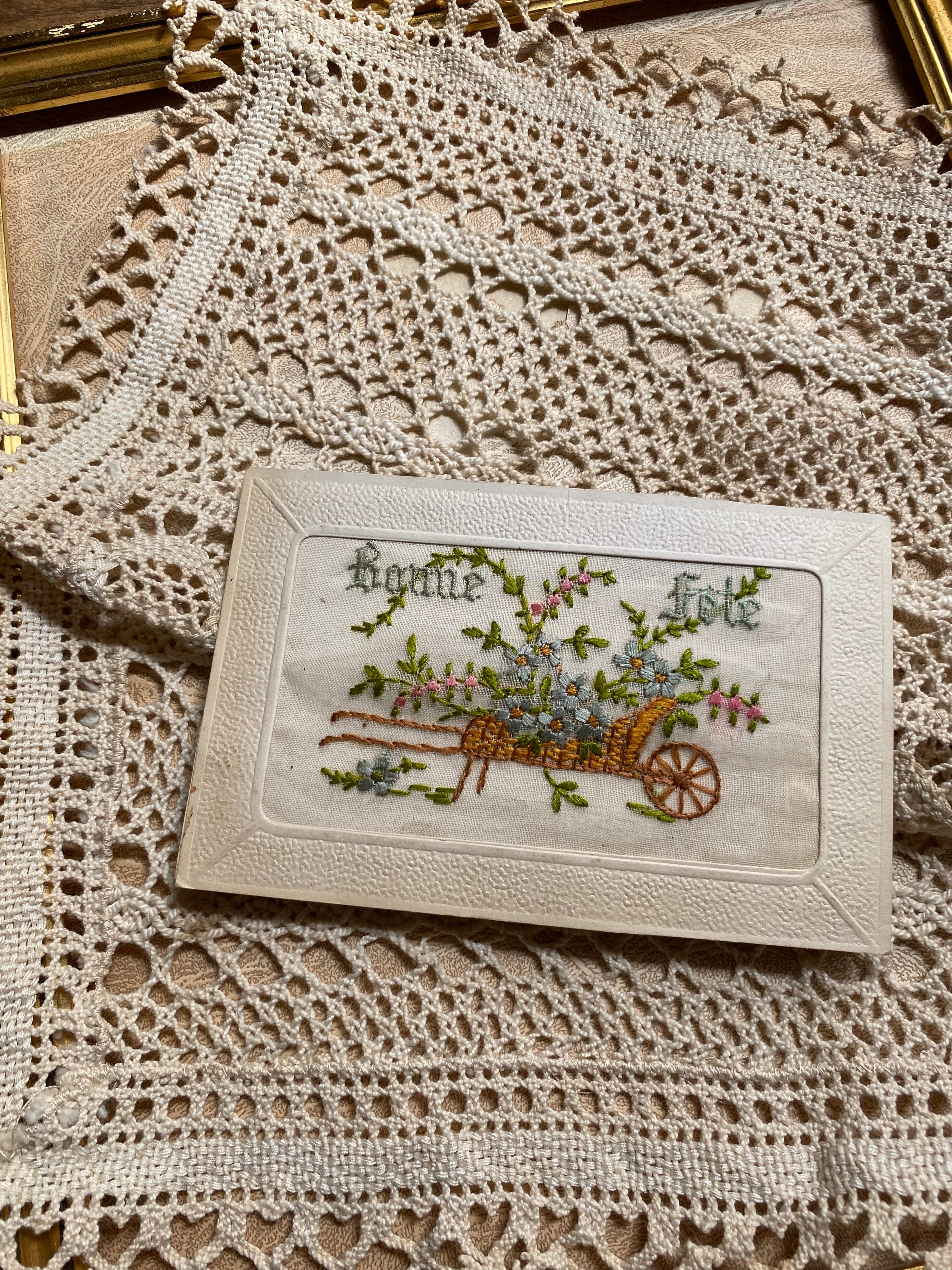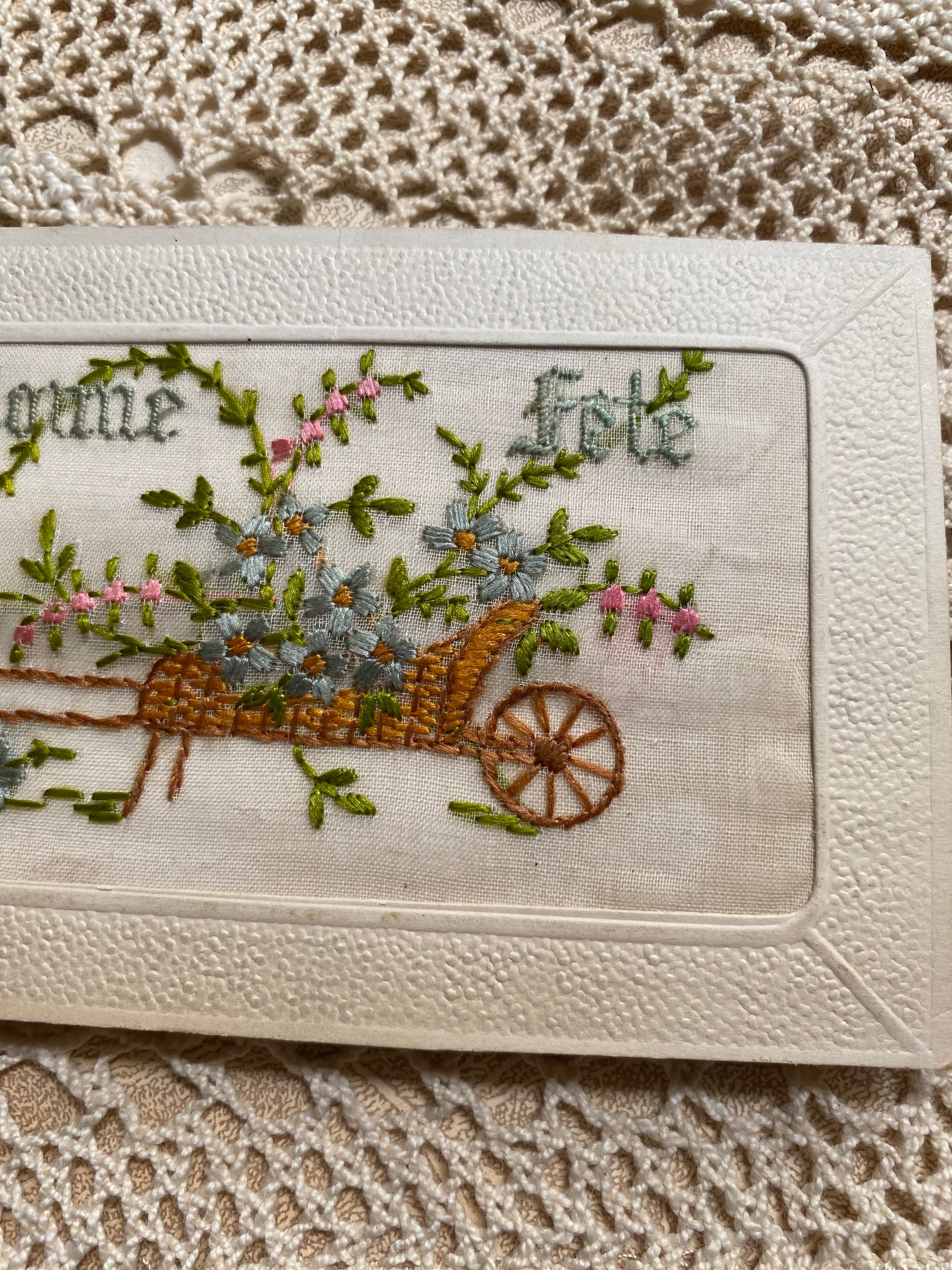 フランスのおよそ100年前の手刺繍カードになります。勿忘草と押し車を刺繍した薄いオーガンジーをポストカードに貼り付けた大変美しいカードです。