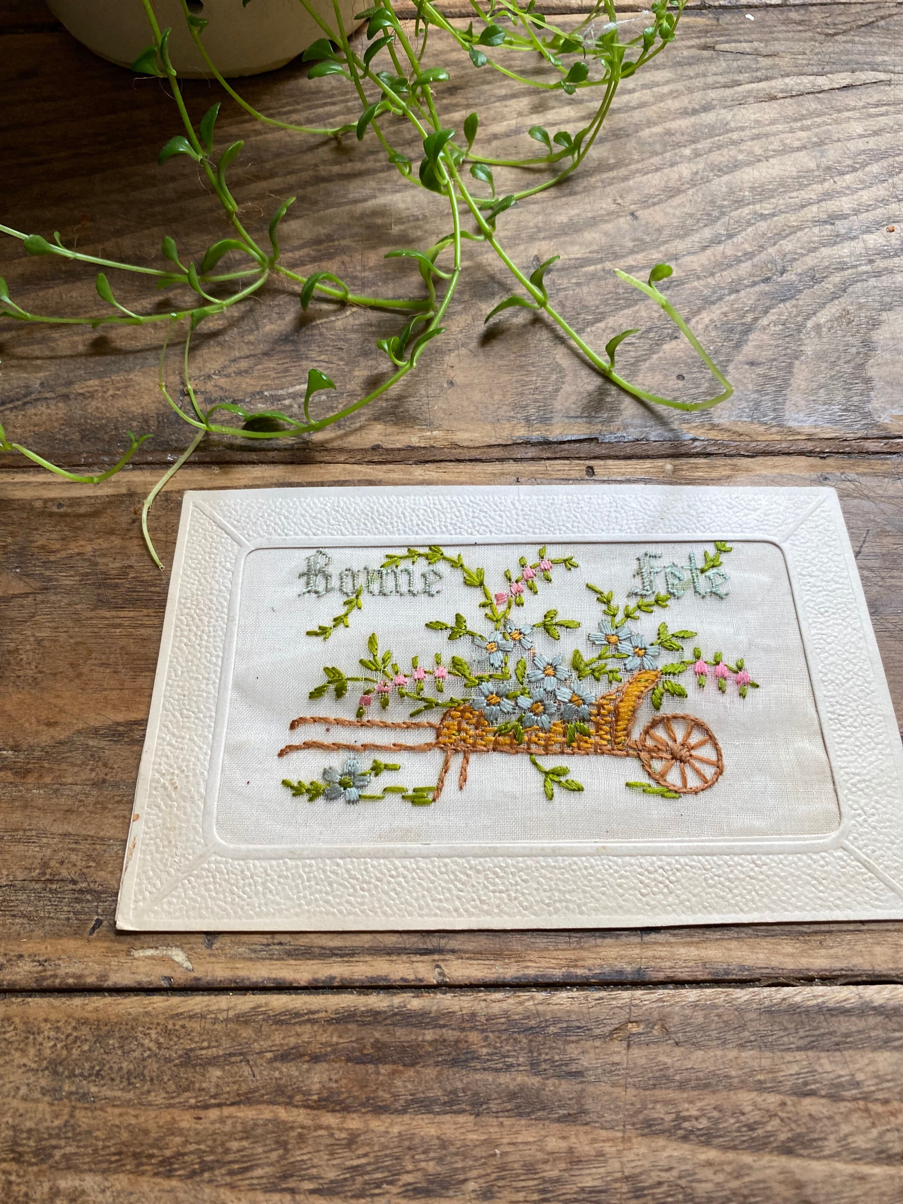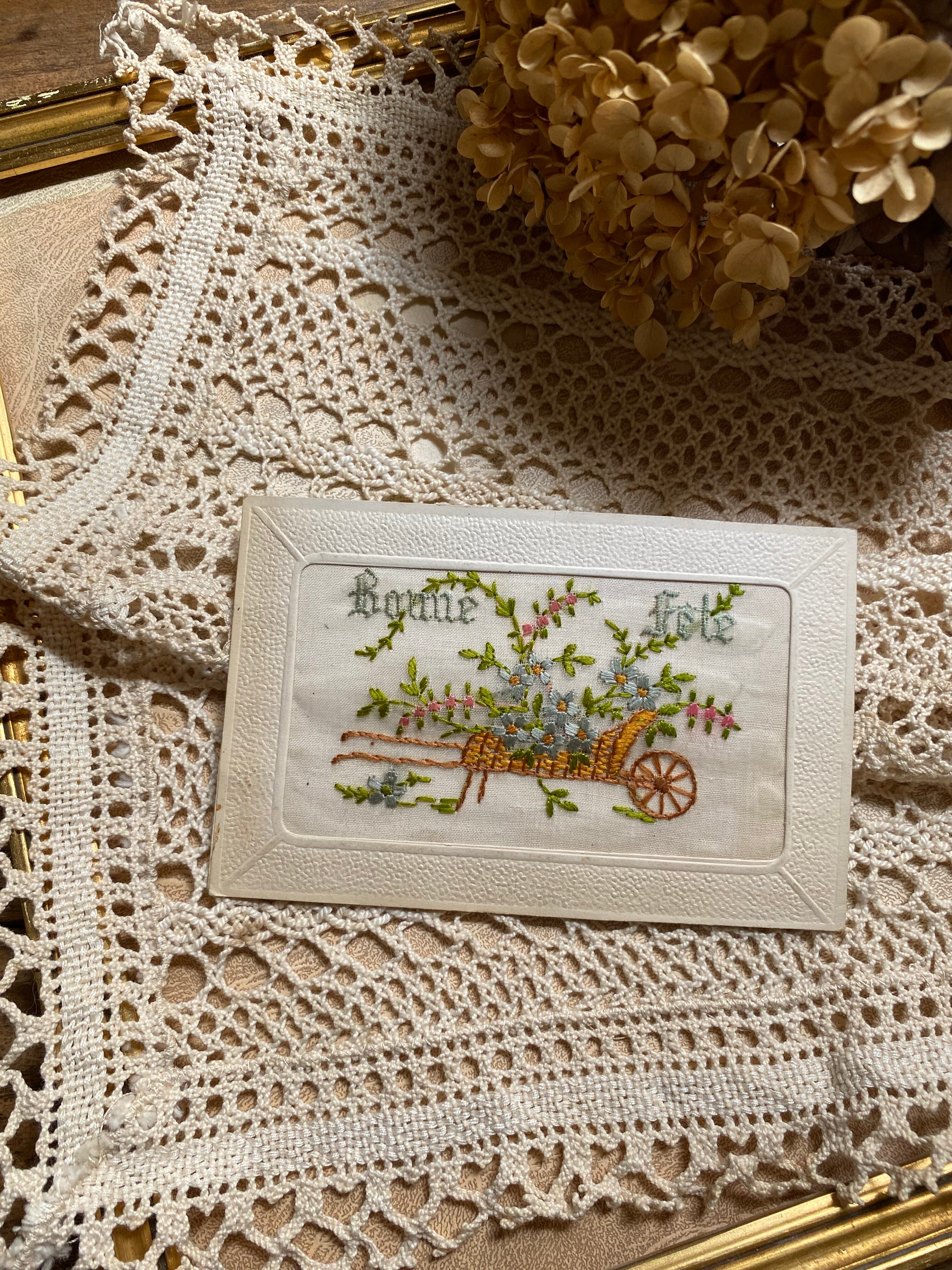 勿忘草と押し車 手刺繍カード フランスアンティーク アンティーク雑貨