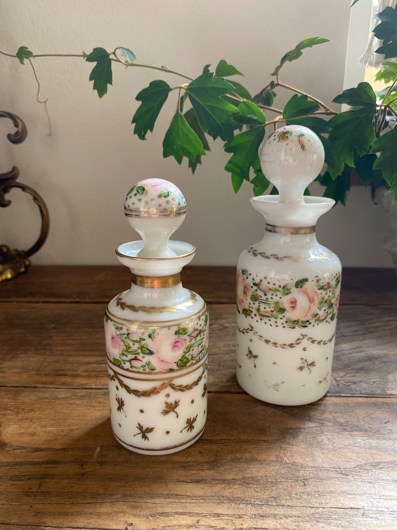 オパリンガラスの化粧ボトル B ナポレオン三世 手描き フランスアンティーク オパリンガラス フランスアンティーク雑貨