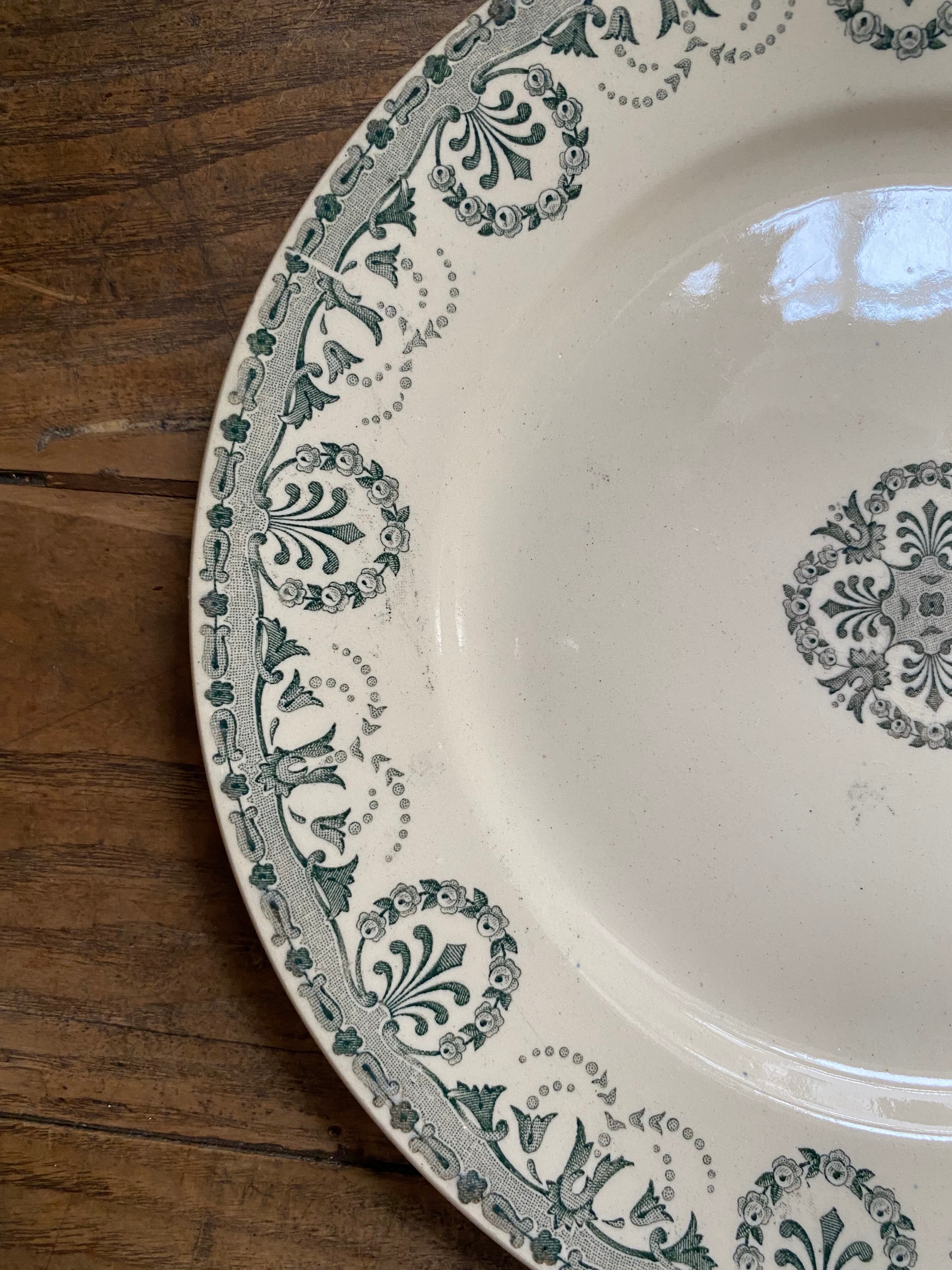 アイボリーの陶器に淡いグリーンの濃淡でアラベスク模様のような繊細な柄が描かれた優美な器です。