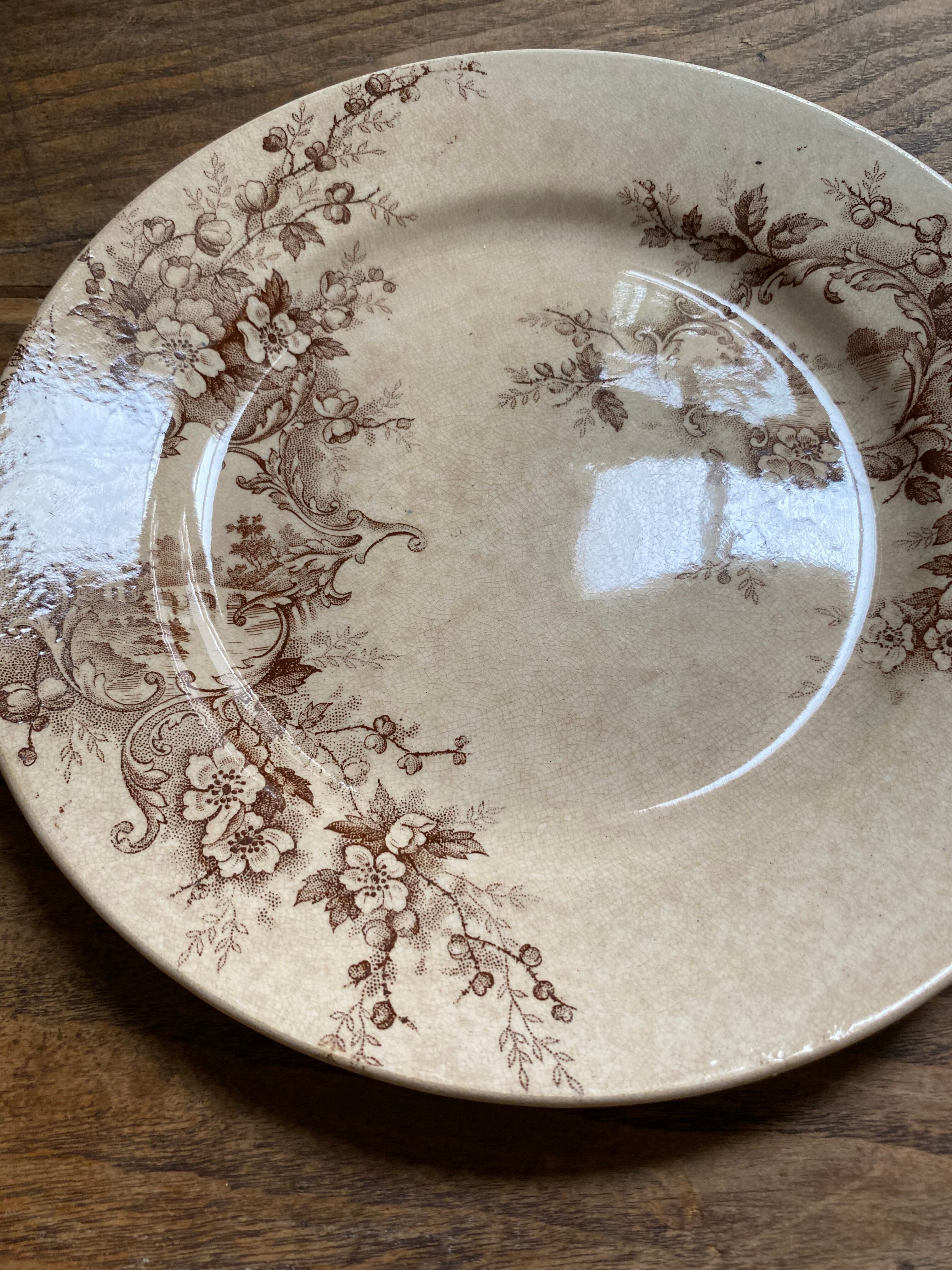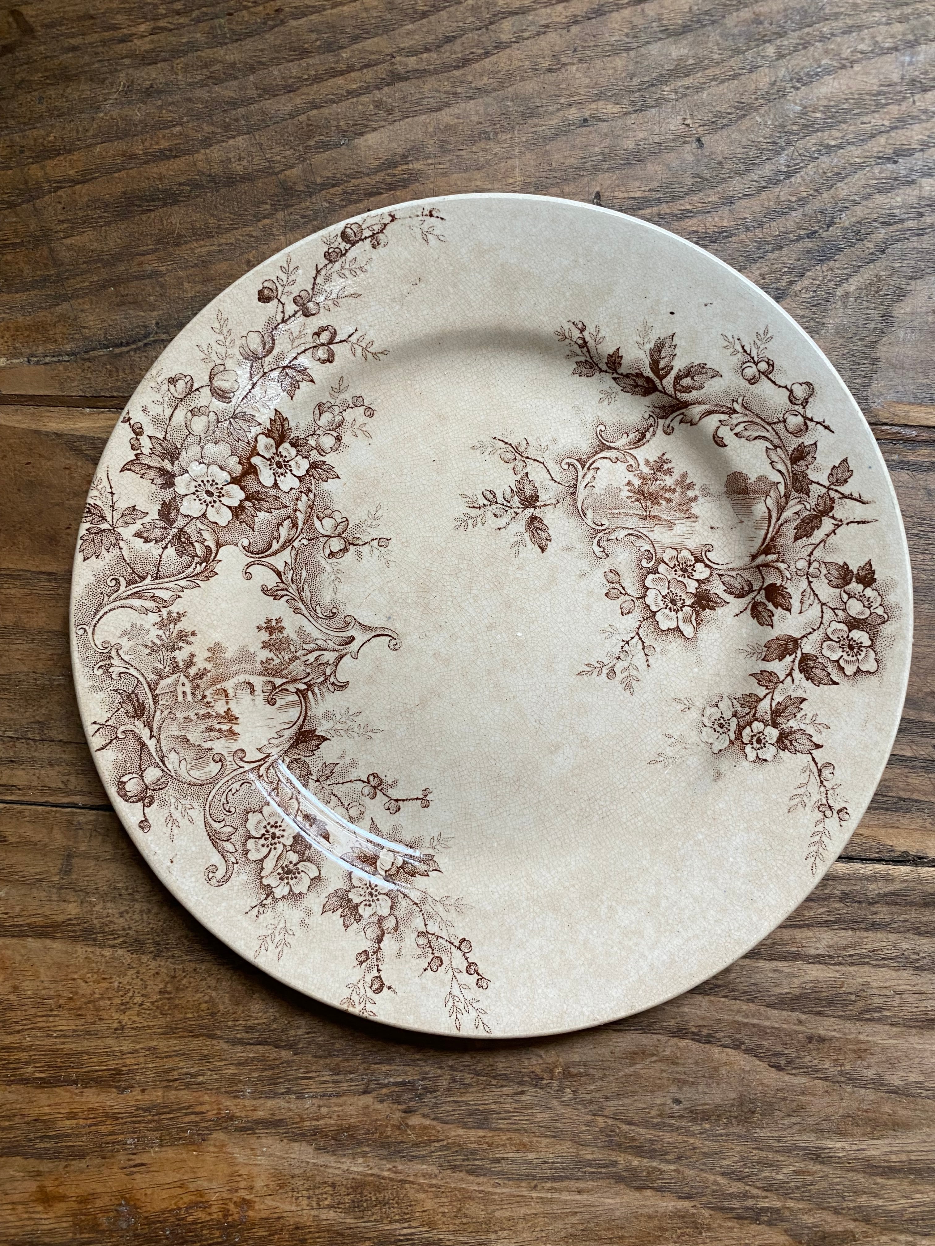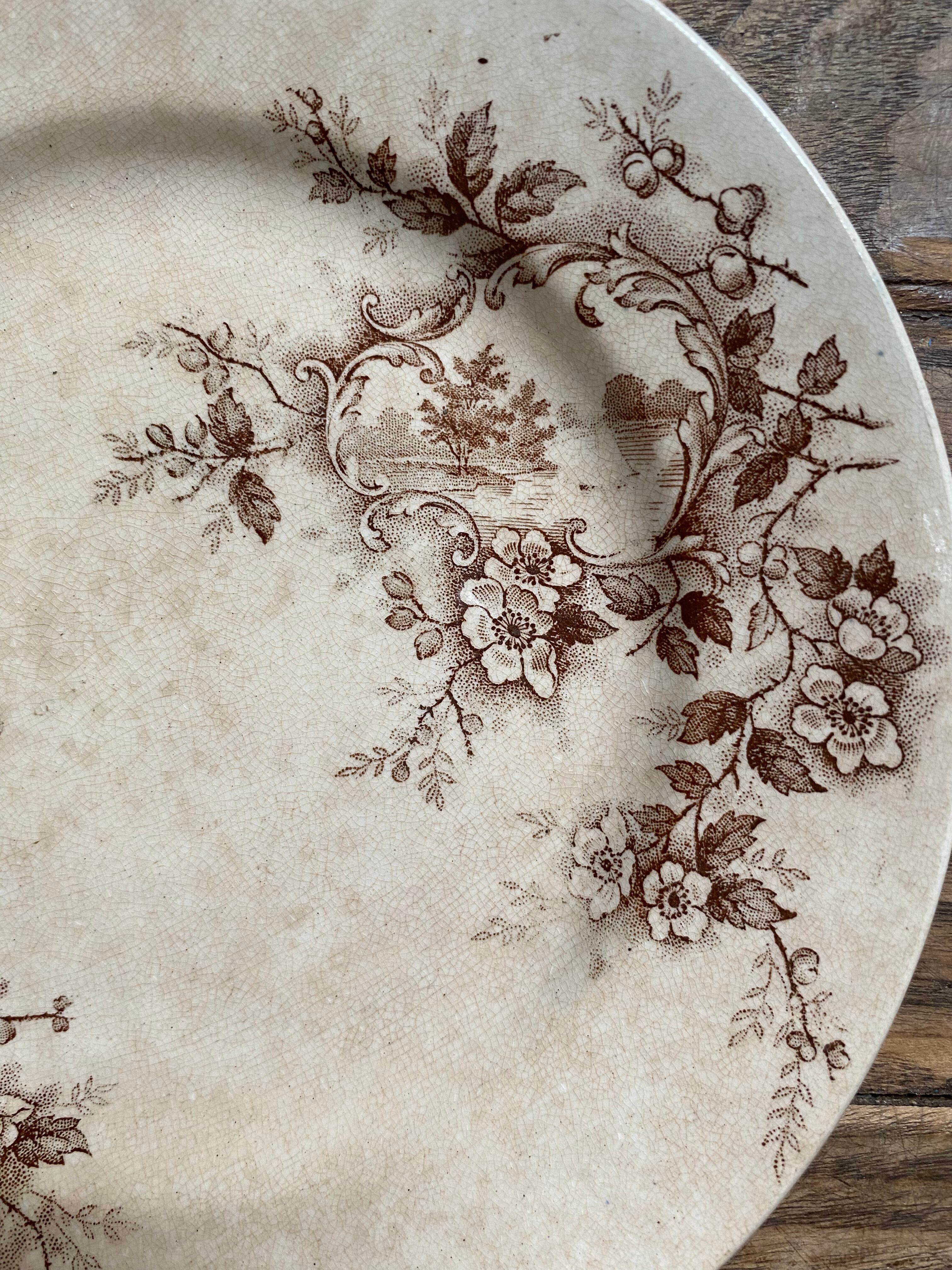 サンザシの花に縁どられ、ロカイユを型どったなかにはフランスの田舎の風景が描かれています。クリームカラーほ陶肌とマロンカラーの温かみを感じるイメージ。