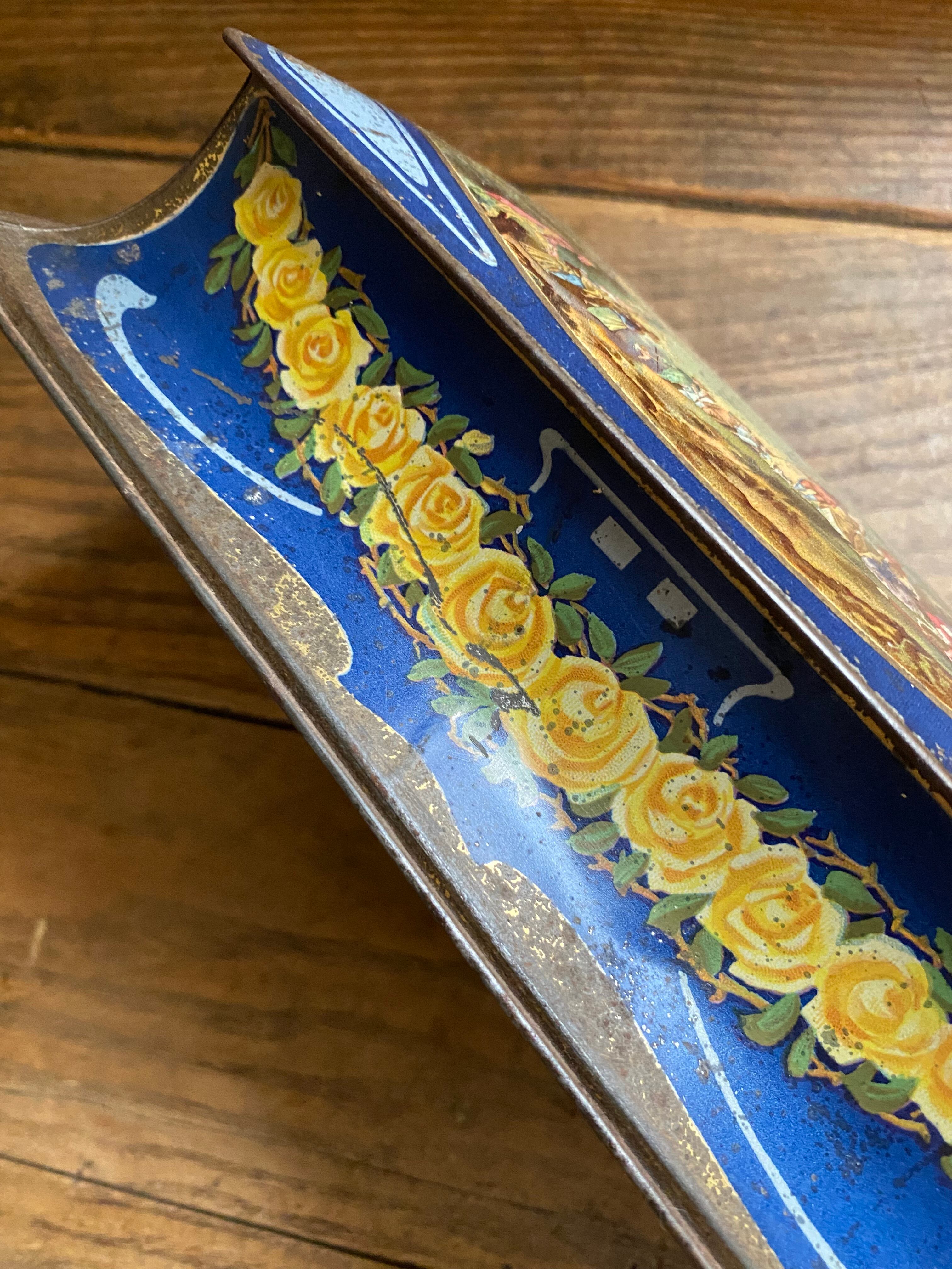 ブルーに黄色いバラ、蓋の部分にはほのぼのとした人々の様子が描かれています。小さくて見にくいのですが天使の姿も、、。
