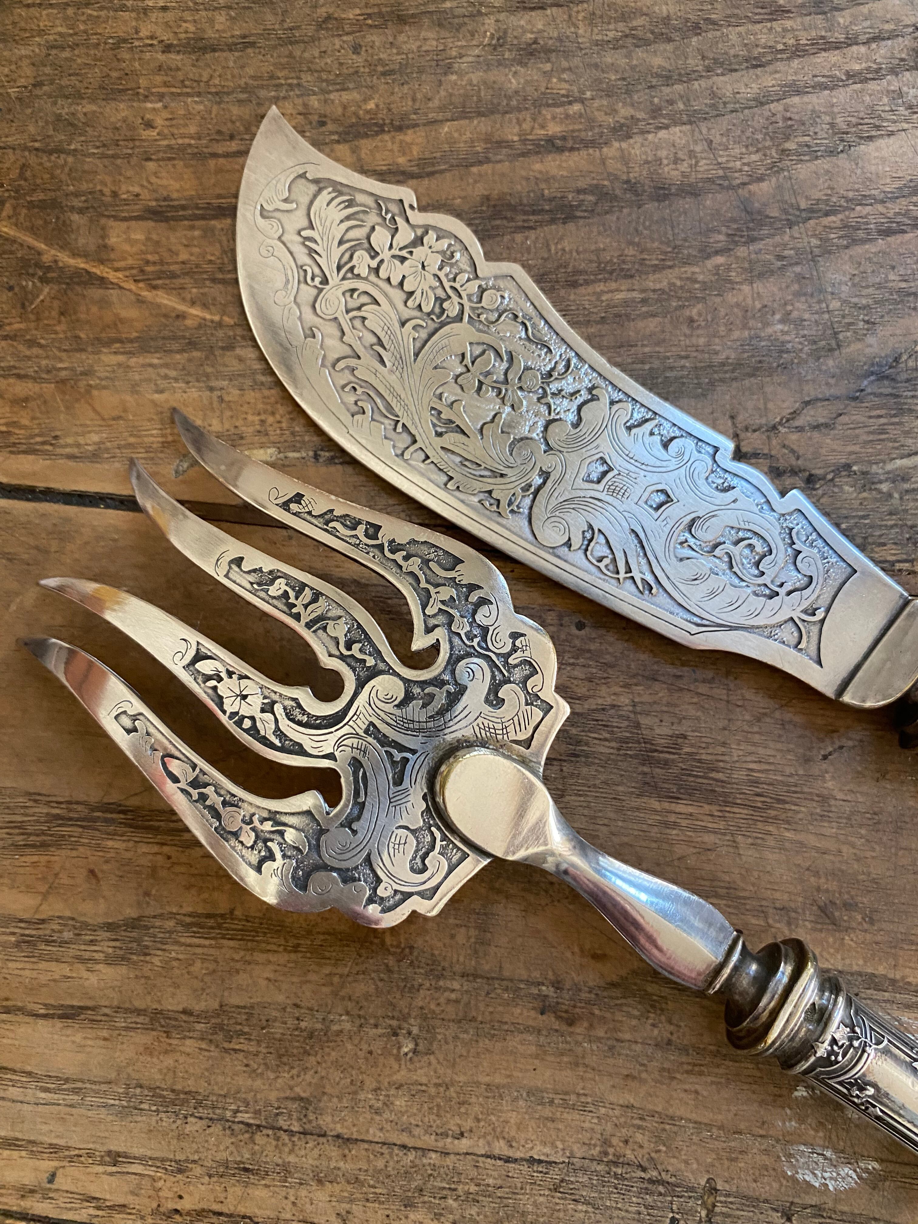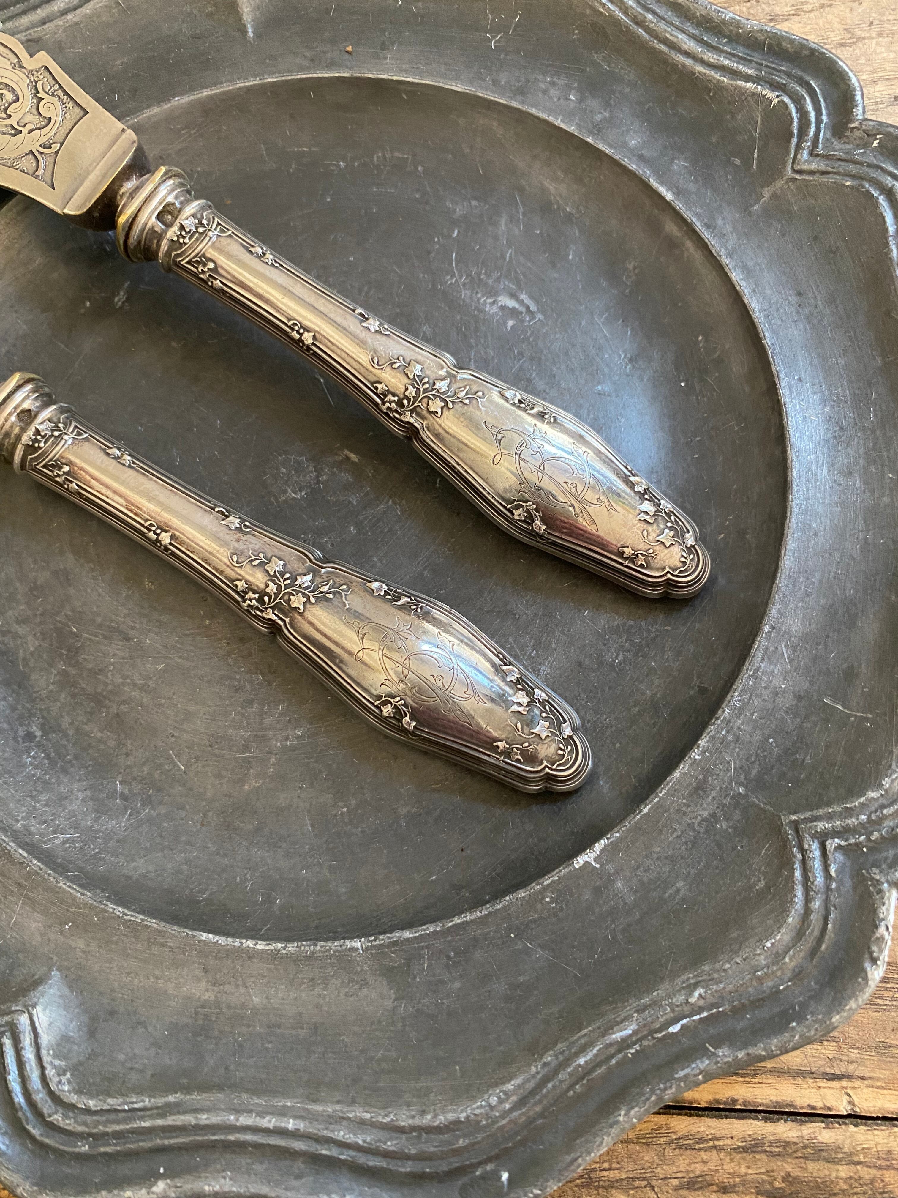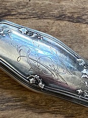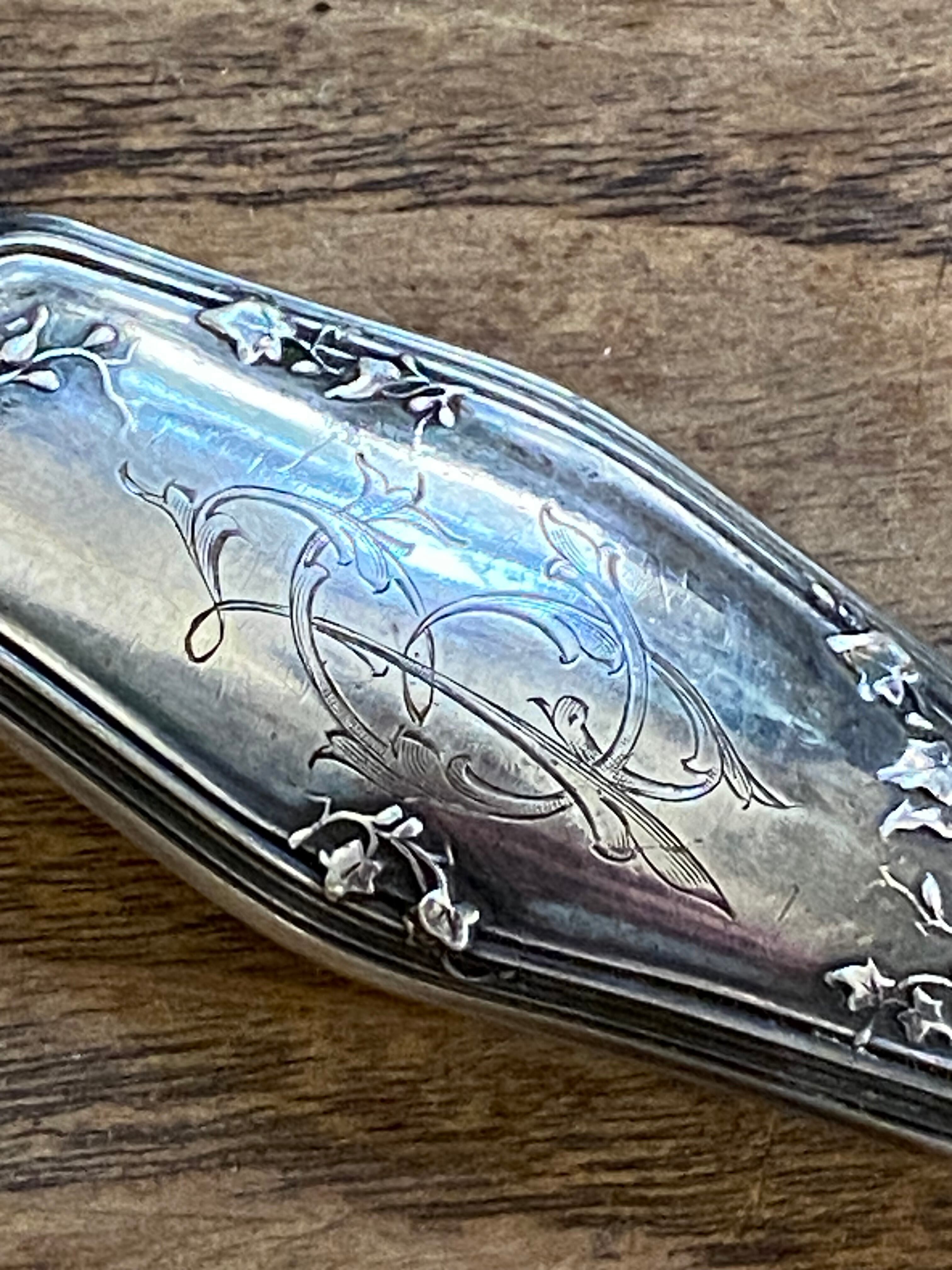 手彫りのアール・ヌーヴォーデザインが美しく、ハンドルの装飾模様は植物デザインにイニシャルが彫られたものになります。