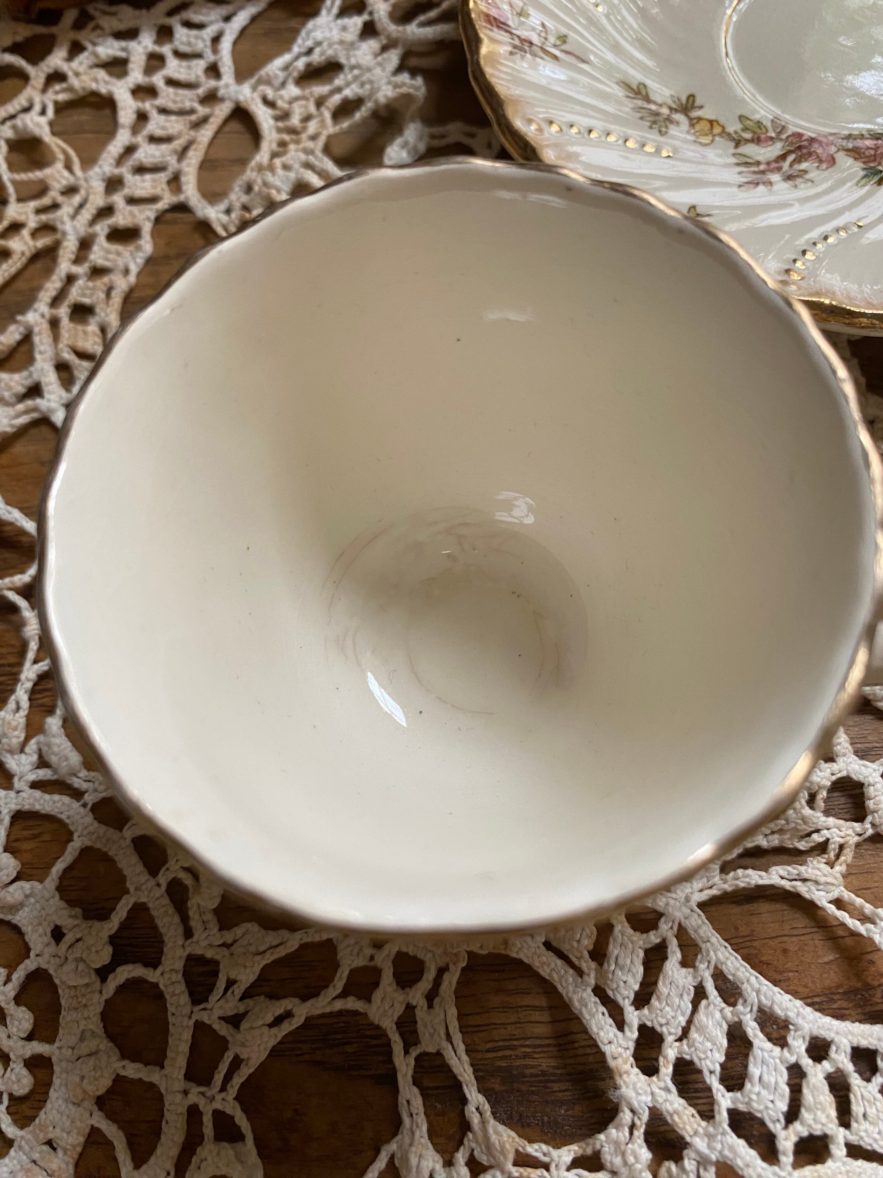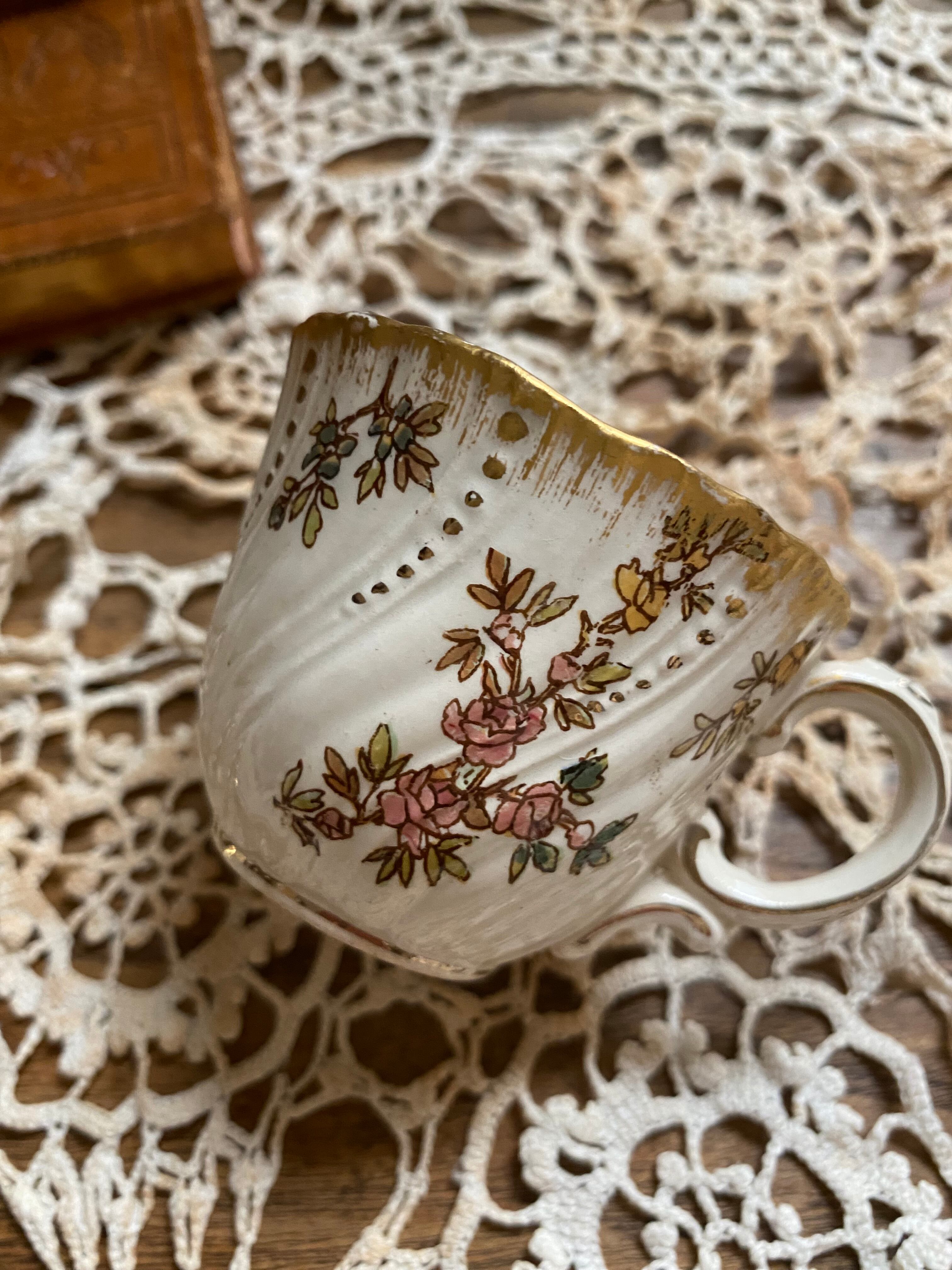 繊細で優美なレリーフに金彩が美しく、描かれた花々が華やかで可愛らしいお品です。