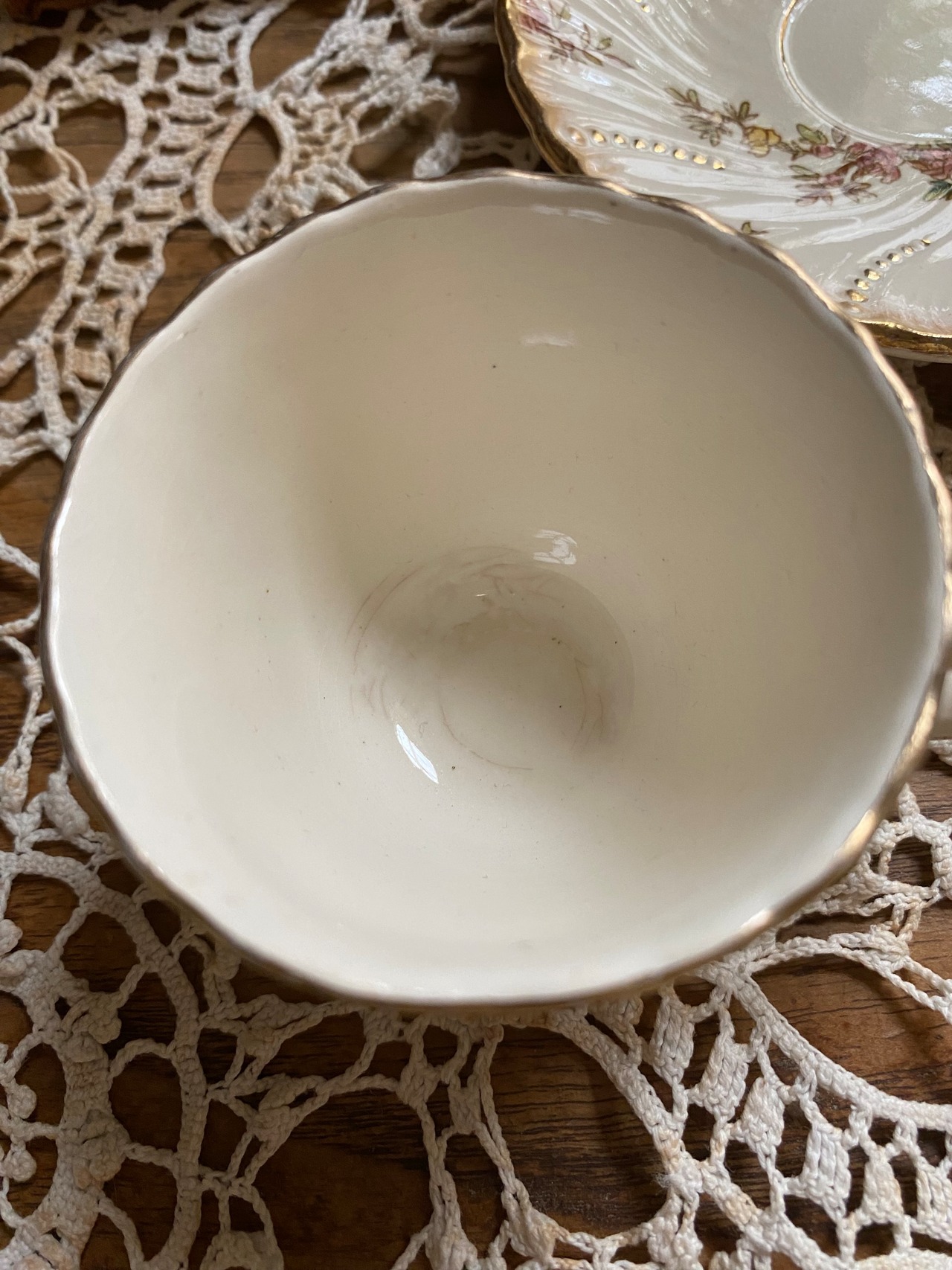 ソーサーの縁の金彩はとても綺麗に残っております。青いお花の模様あたりにシミが見られます。