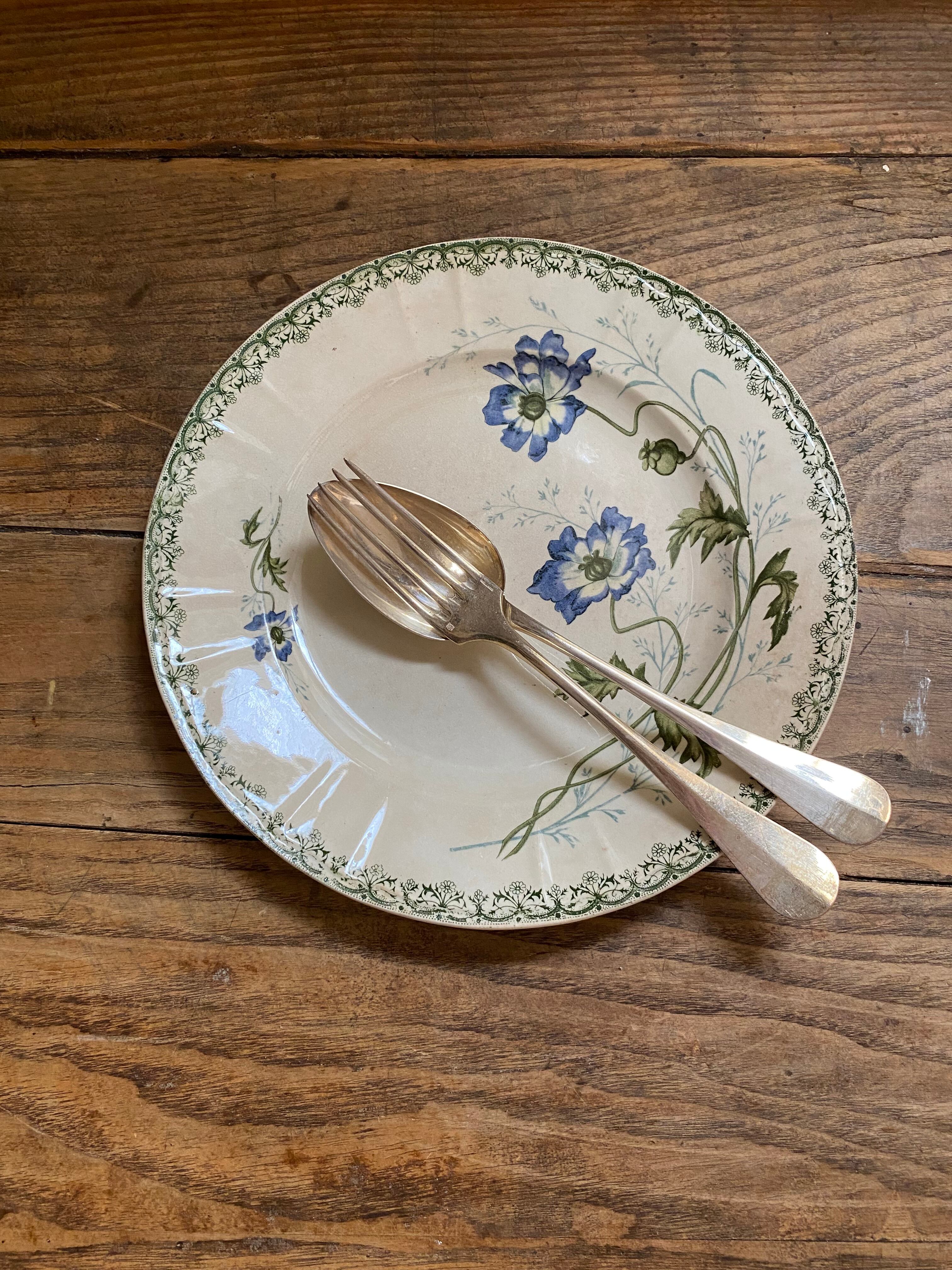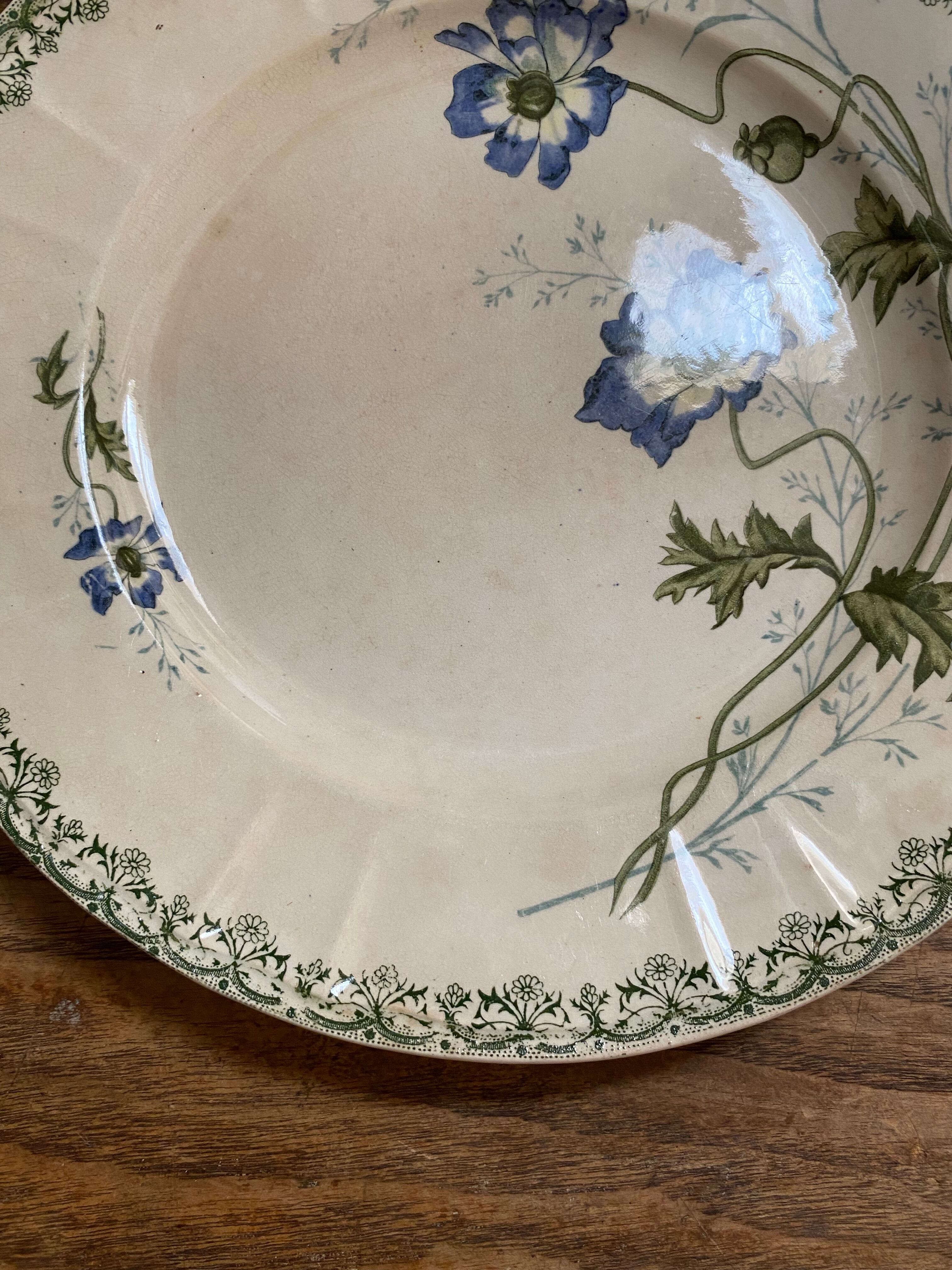 こちらは経年変化でアンティークカラーに染まった色味となっております。白から移り染まったプレートには紫色のポピーの花が愉しげに咲き誇った姿が描かれています。深みのあるグリーンでリムを彩るポピーの姿もまるでレースのように優しげな雰囲気を醸し出してます。