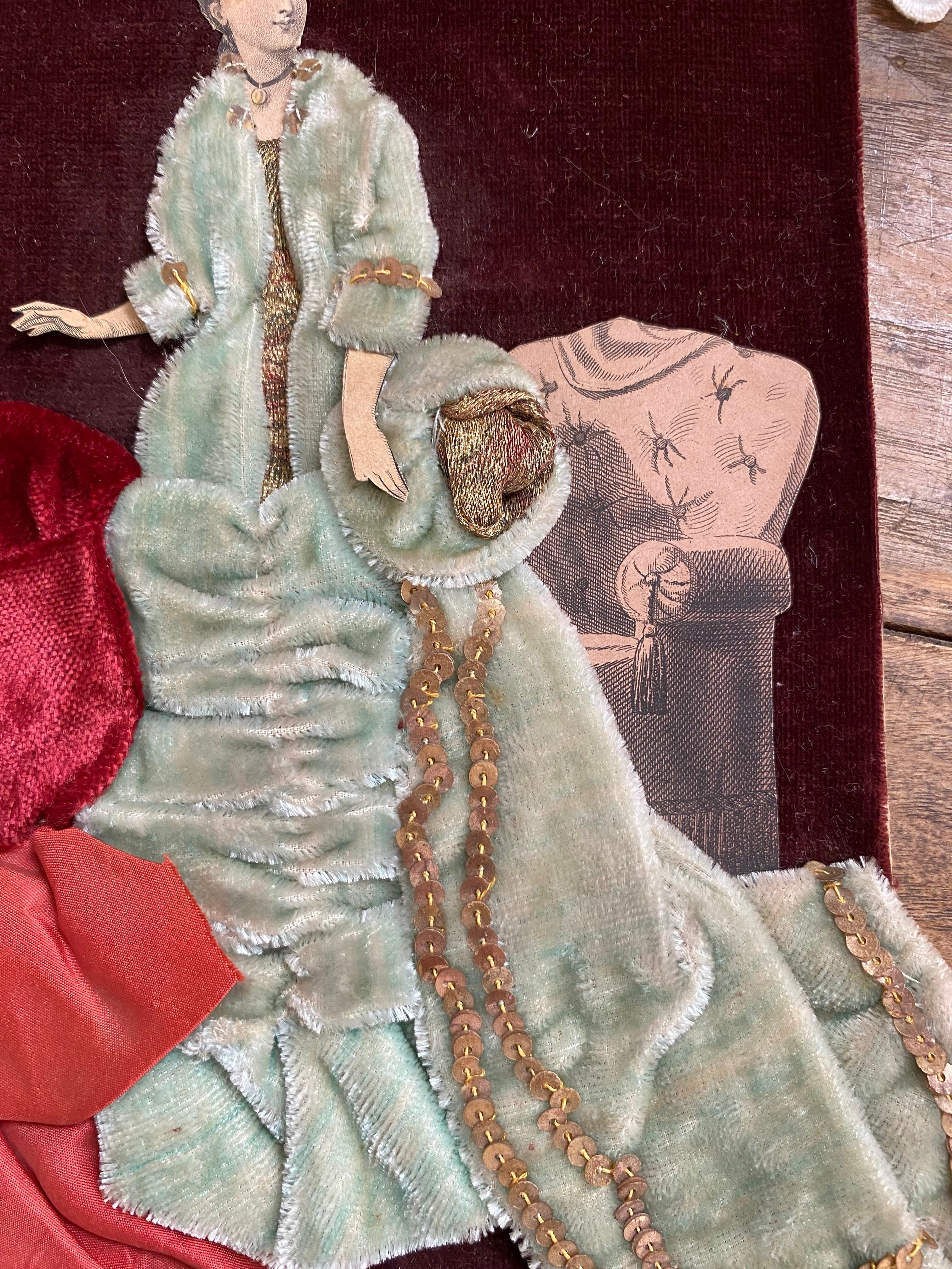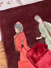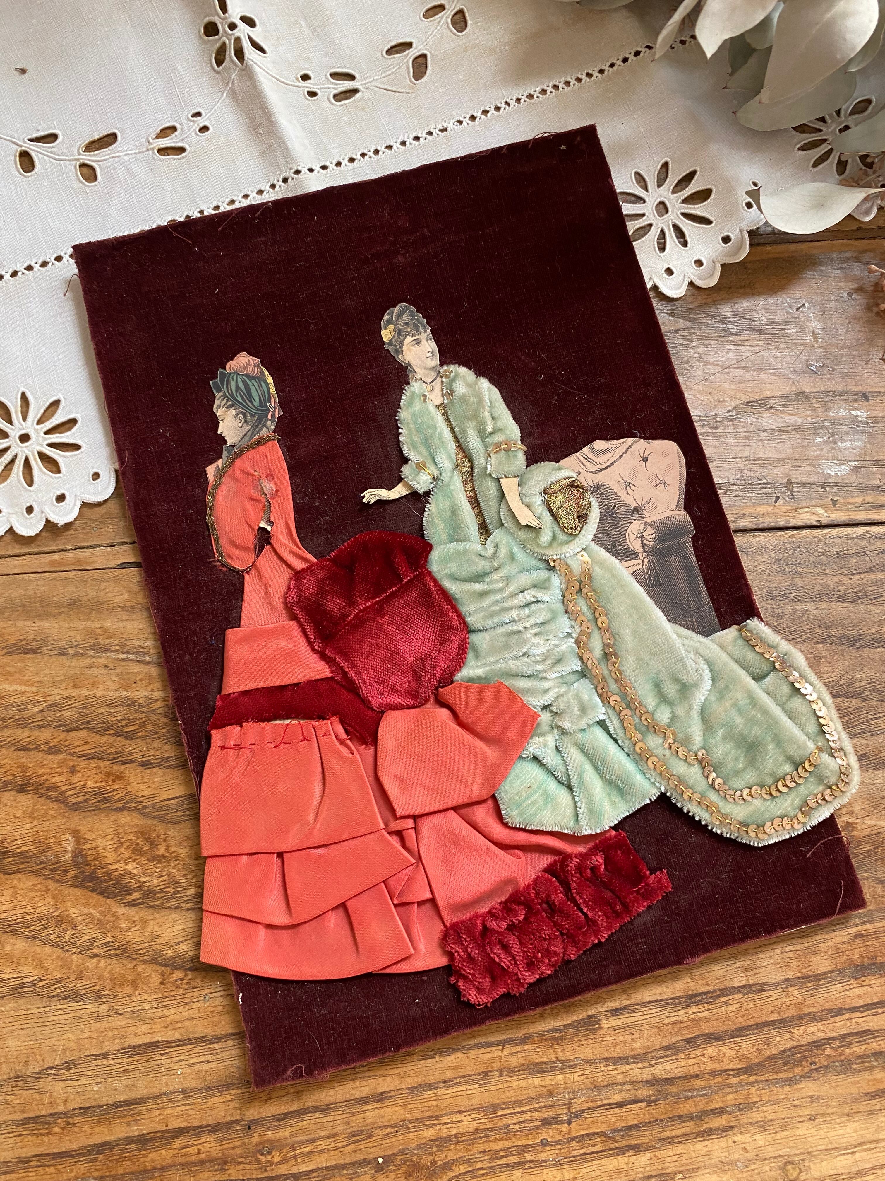フランスのモード画、ファッションイラスト画を切り取り、深みのあるワインレッドカラーのベルベット素材が台紙となっています。