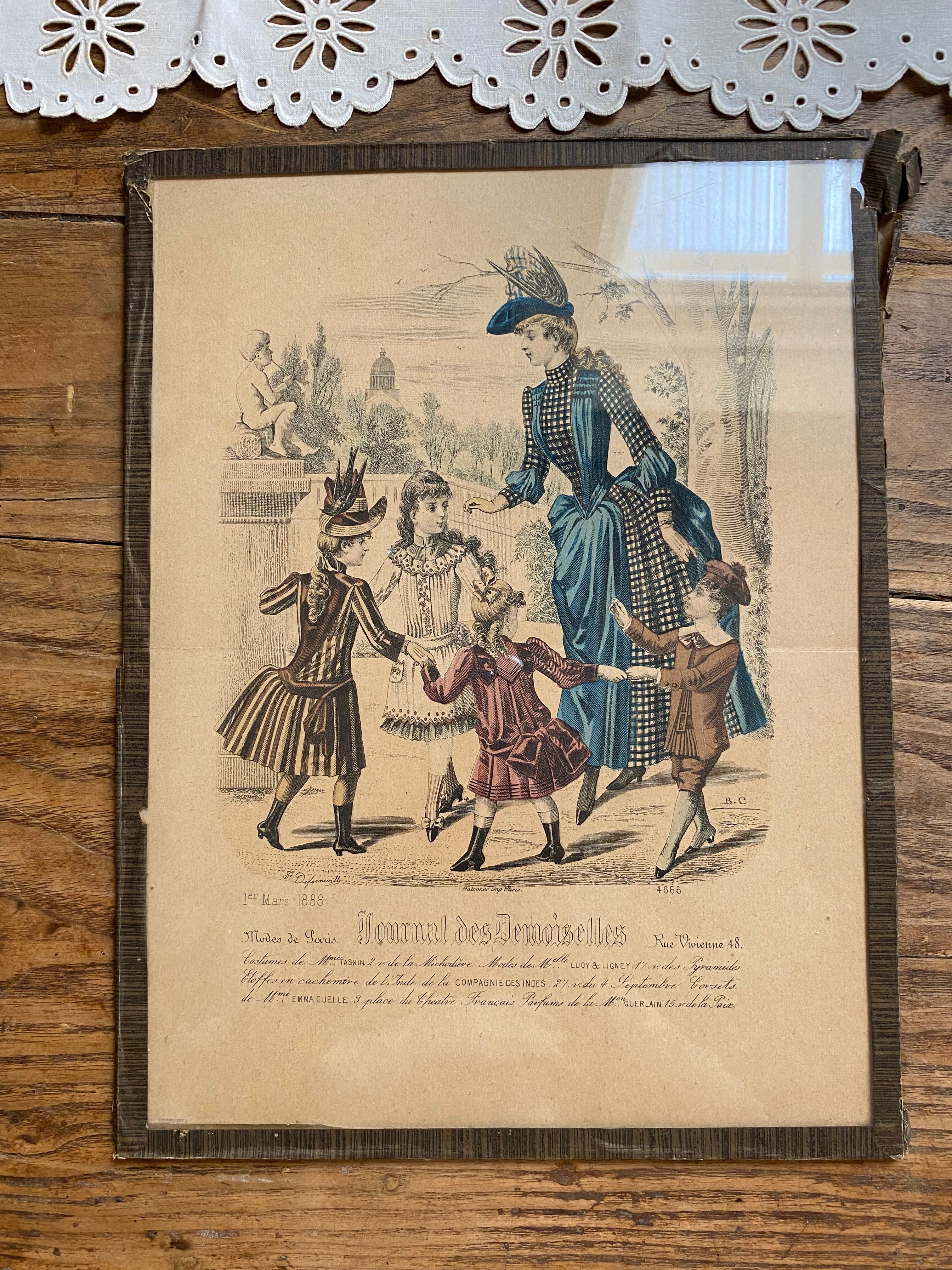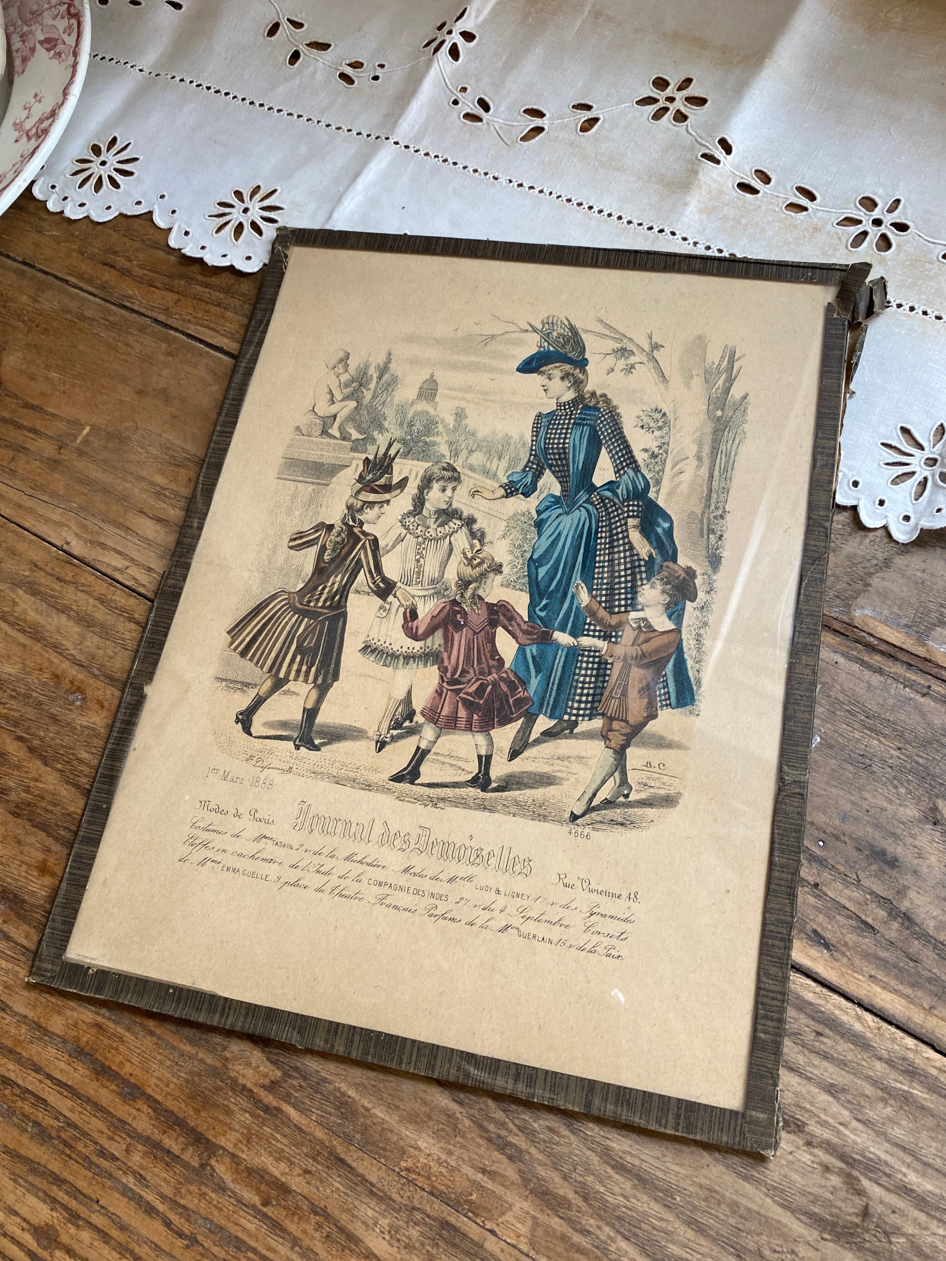 ガラス付きファッションイラスト画 フランスアンティーク アンティークモード画 銅版画