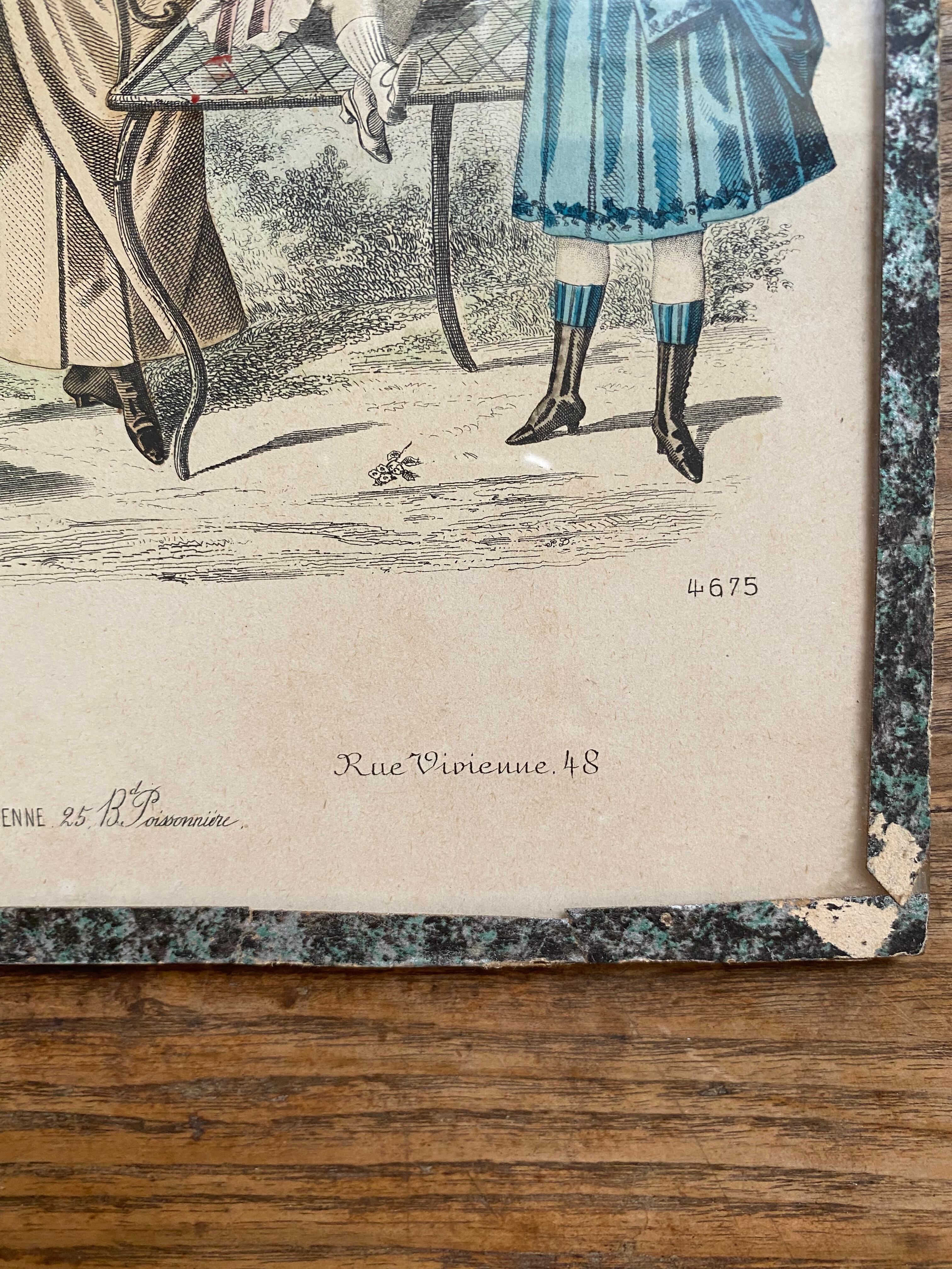 ガラス付きファッションイラスト画 フランスアンティーク アンティークモード画 銅版画