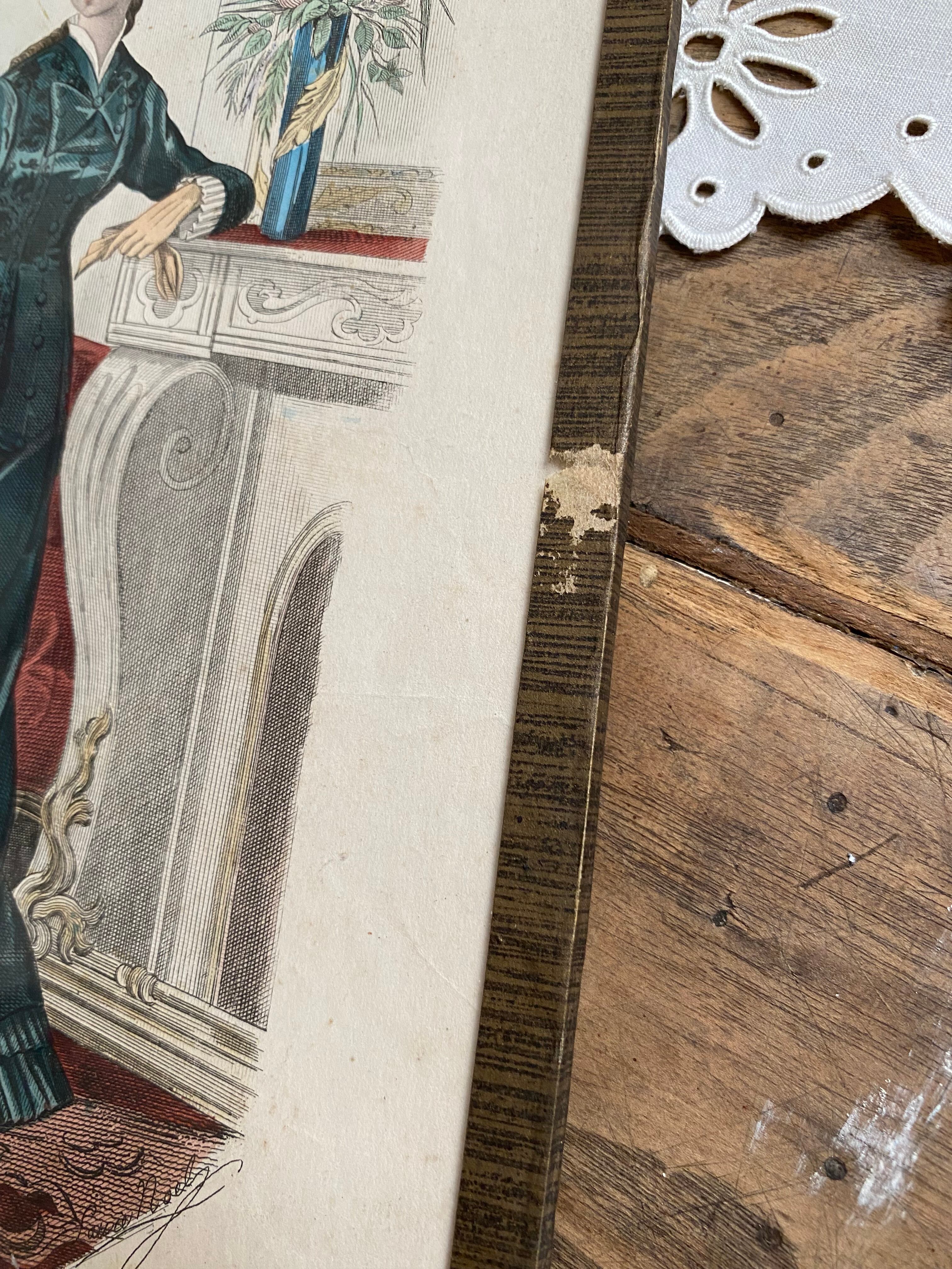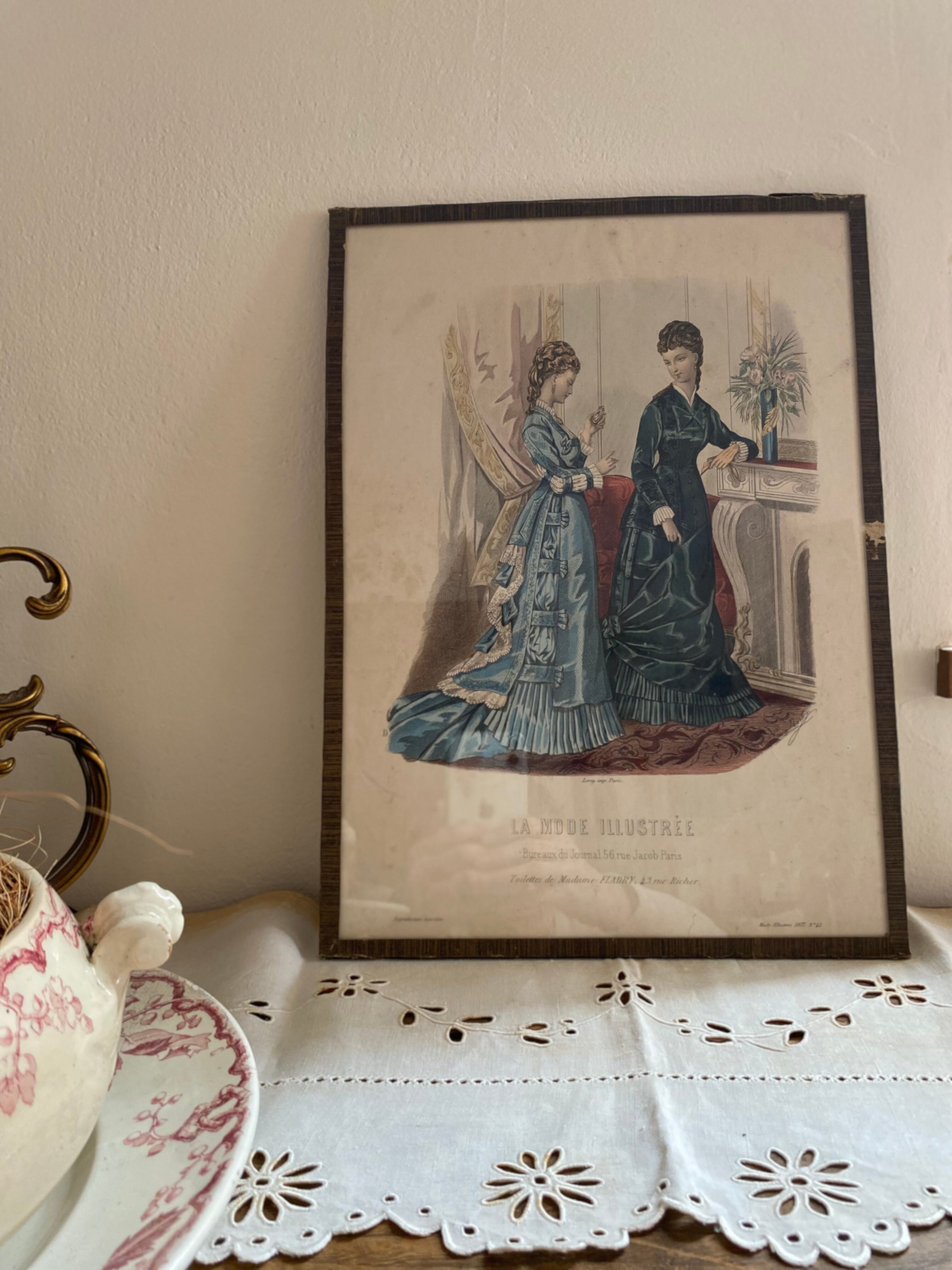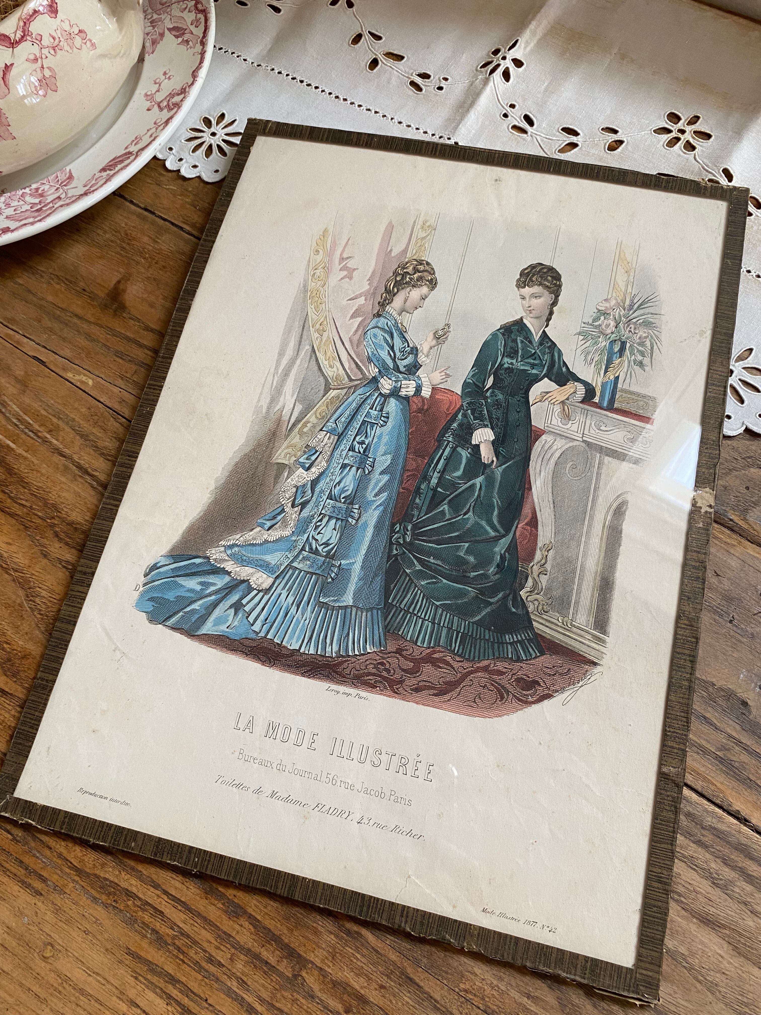 ガラス付きファッションイラスト画 フランスアンティーク アンティークモード画 銅版画