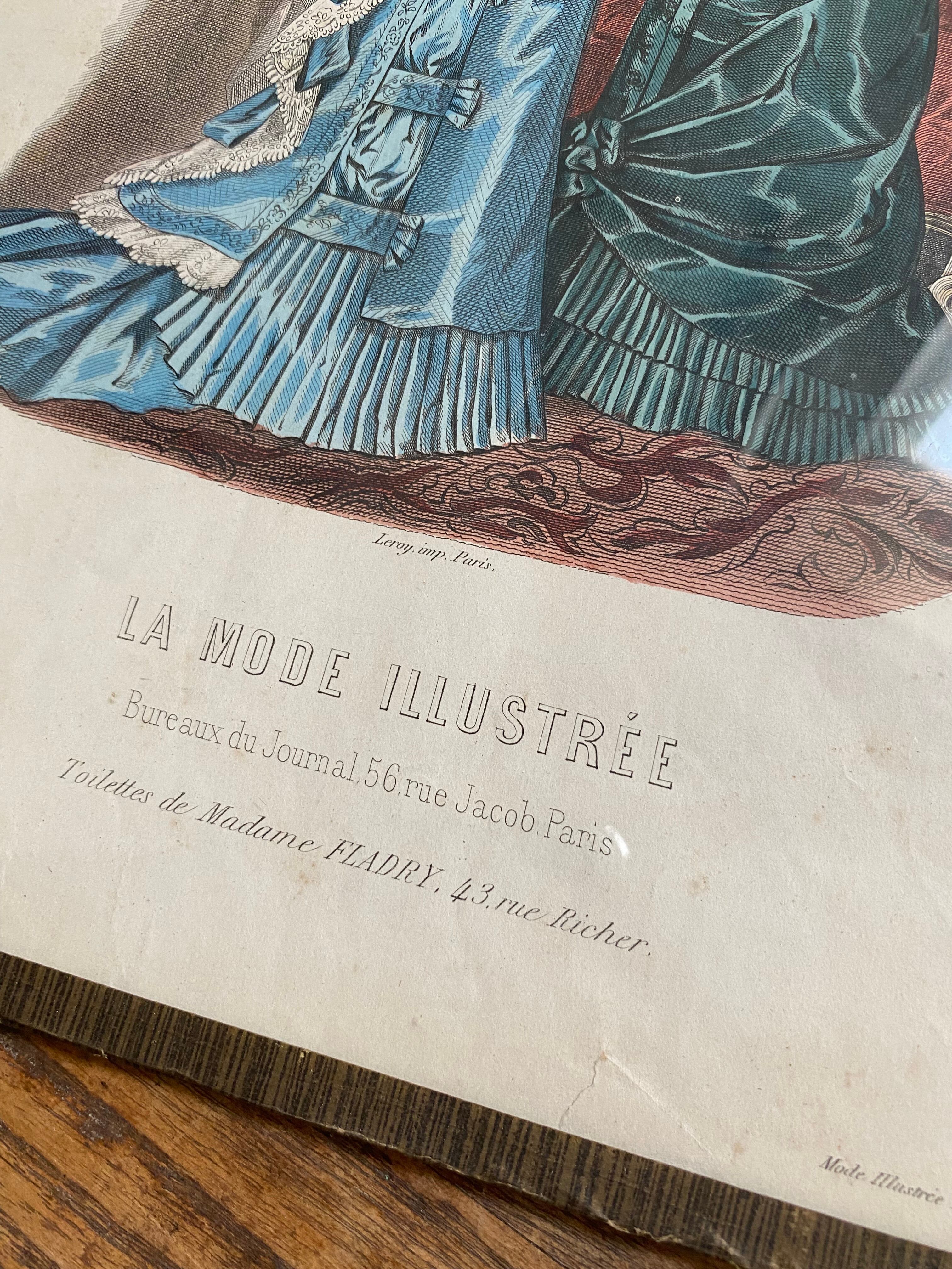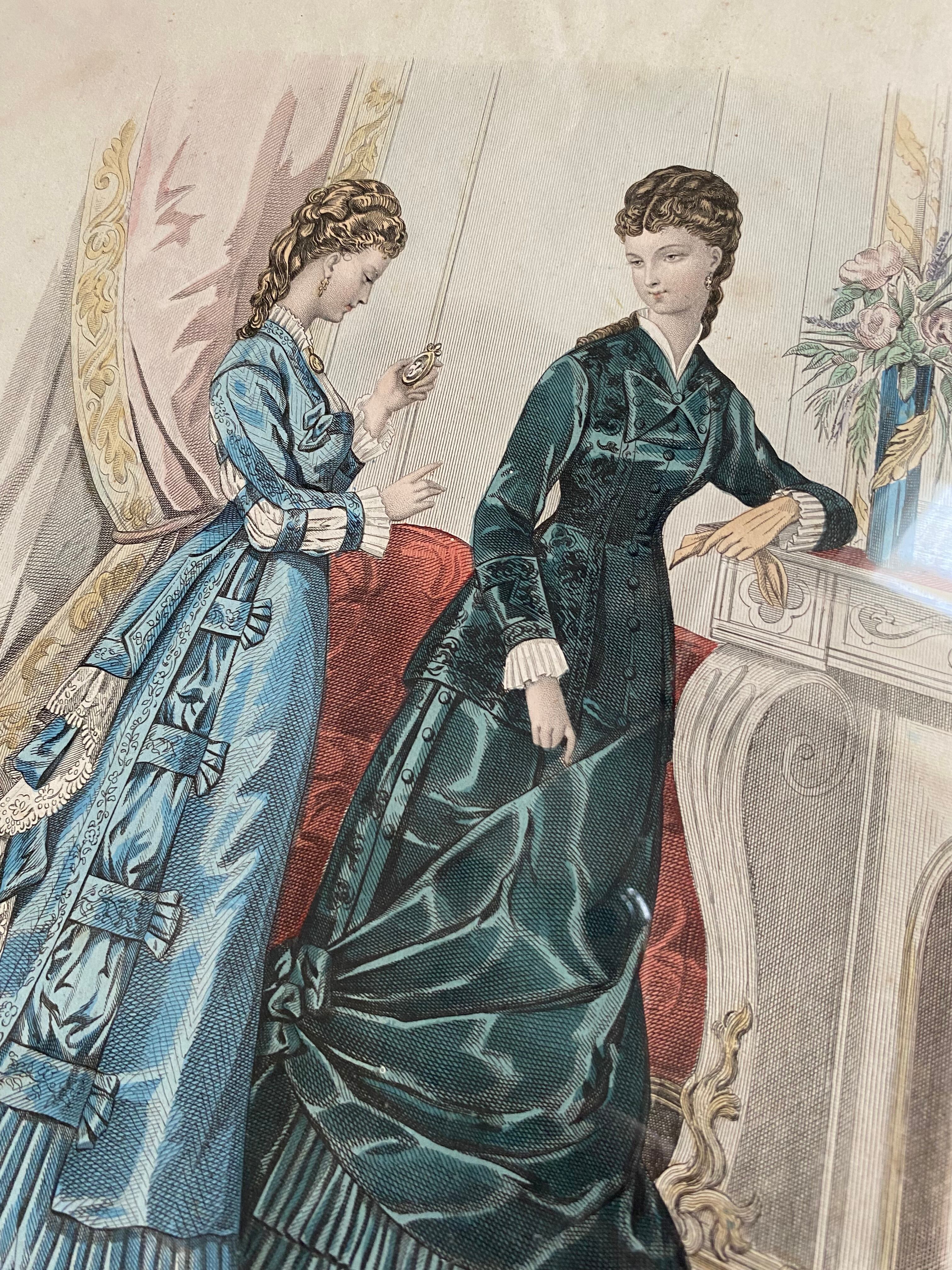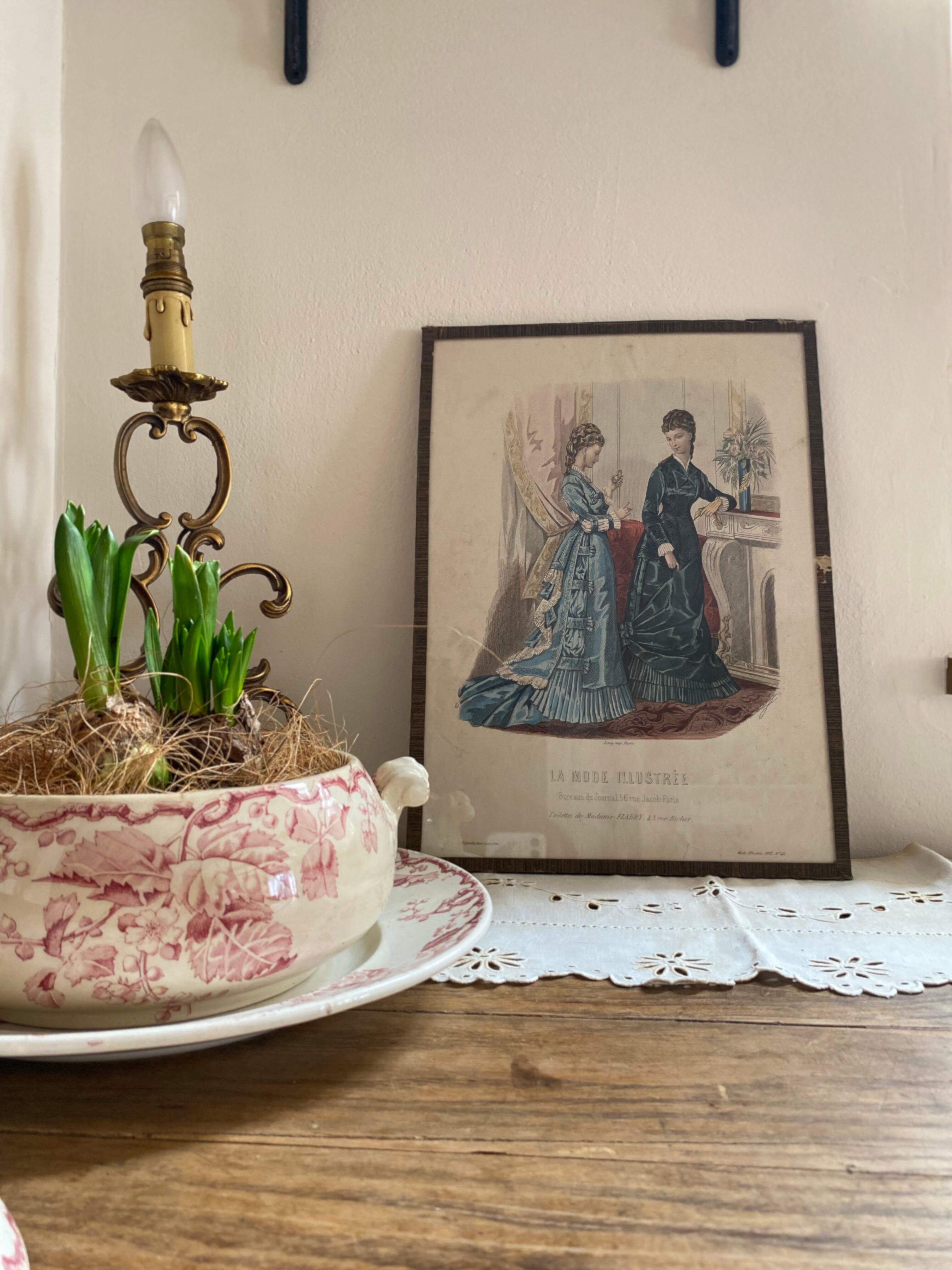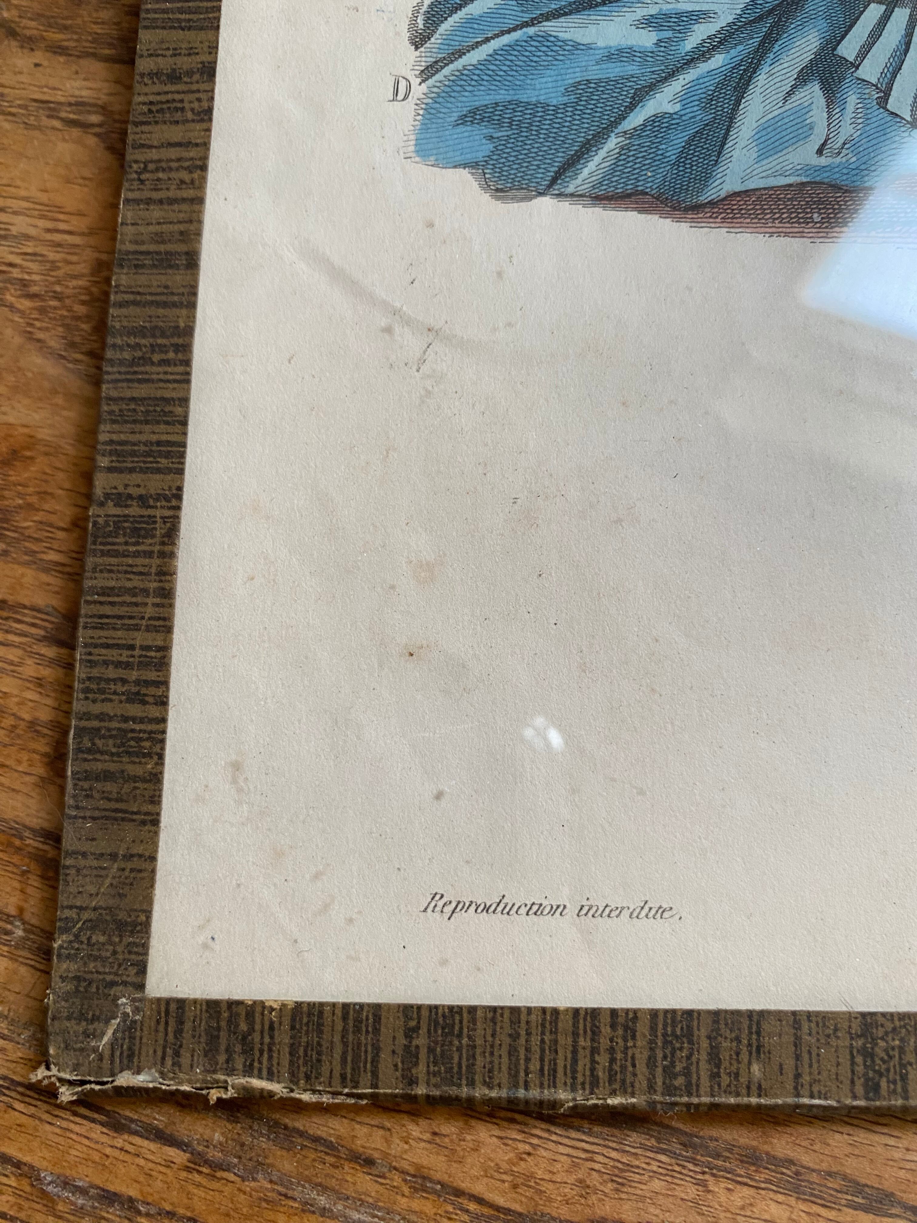ガラス付きファッションイラスト画 フランスアンティーク アンティークモード画 銅版画